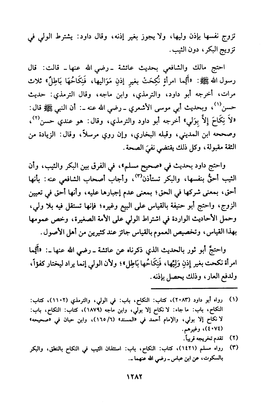 (¬1) رواه أبو داود (2083)، كتاب: النكاح، باب: في الولي، والترمذي (1102)، كتاب: النكاح، باب: ما جاء: لا نكاح إلا بولي، وابن ماجه (1879)، كتاب: النكاح، باب: لا نكاح إلا بولي، والإمام أحمد في "المسند" (6/ 165)، وابن حبان في "صحيحه" (4074)، وغيرهم.