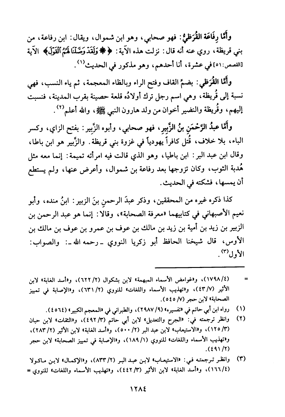 وأَمَّا عبدُ الرَّحْمَنِ بنُ الزَّبِيرِ، فهو صحابي، وأبوه الزبِير: بفتح الزاي، وكسر الباء، بلا خلاف، قُتل كافرًا يهوديًّا في غزوة بني قريظة. والزَّبير هو ابن باطا، وقال ابن عبد البر: ابن باطيا، وهو الذي قالت فيه امرأته تميمة: إنما معه مثل هُدبة الثوب، وكان تزوجها بعد رفاعة بن شموال، وأعرض عنها، ولم يستطع أن يمسها، فشكته في الحديث.