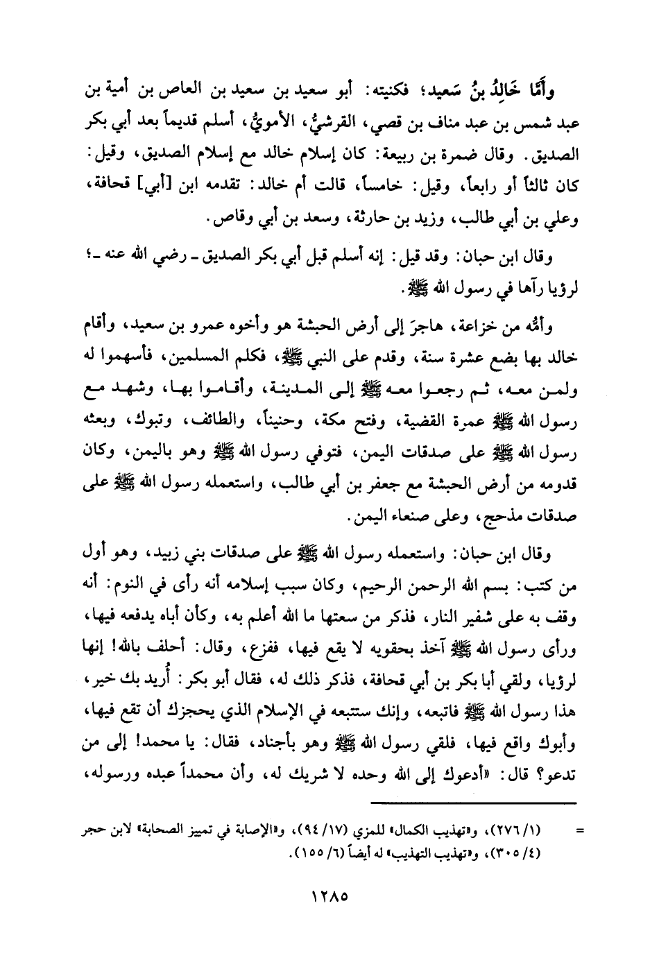 وأَمَّا خَالِدُ بنُ سَعيد؛ فكنيته: أبو سعيد بن سعيد بن العاص بن أمية بن عبد شمس بن عبد مناف بن قصي، القرشيُّ، الأمويُّ، أسلم قديمًا بعد أبي بكر الصديق. وقال ضمرة بن ربيعة: كان إسلام خالد مع إسلام الصديق، وقيل: كان ثالثًا أو رابعًا، وقيل: خامسًا، قالت أم خالد: تقدمه ابن [أبي] قحافة، وعلي بن أبي طالب، وزيد بن حارثة، وسعد بن أبي وقاص.