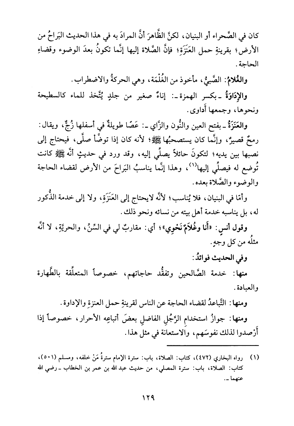 والعَنَزَةُ -بفتح العين والنُّون والزَّاي-: عَصَا طويلةٌ في أسفلها زُجٌّ، ويقال: رمحٌ قصيرٌ، وإنما كان يستصحبُها - صلى الله عليه وسلم - لأنه كان إذا توضَّأ صلَّى، فيحتاج إلى نصبها بين يديه؛ لتكونَ حائلًا يصلِّي إليه، وقد ورد في حديث أنه - صلى الله عليه وسلم - كانت تُوضع له فيصلِّي إليها (¬1)، وهذا إنما يناسبُ البَراحَ من الأرض لقضاء الحاجة والوضوء والصَّلاة بعده.