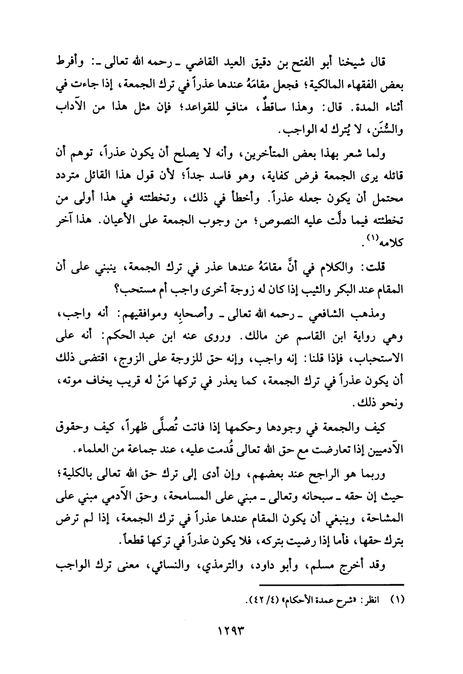 قال شيخنا أبو الفتح بن دقيق العيد القاضي - رحمه الله تعالى -: وأفرط بعض الفقهاء المالكية؛ فجعل مقامَهُ عندها عذرًا في ترك الجمعة، إذا جاءت في أثناء المدة. قال: وهذا ساقطٌ، منافٍ للقواعد؛ فإن مثل هذا من الآداب والسُّنَن، لا، يُترك له الواجب.