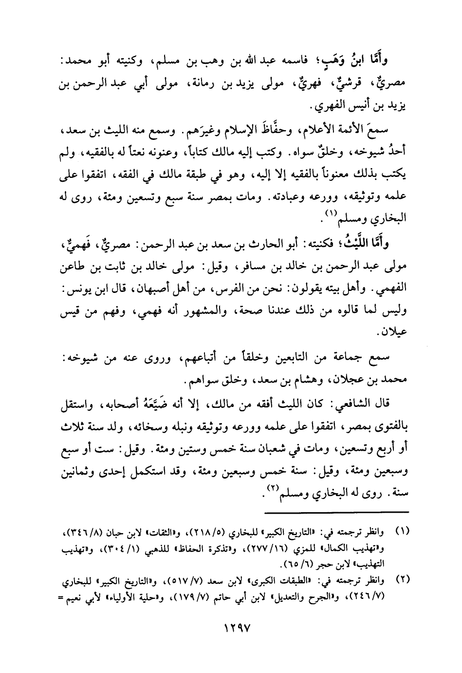 وأَمَّا اللَّيْثُ؛ فكنيته: أبو الحارث بن سعد بن عبد الرحمن: مصريٌّ، فَهميٌّ، مولى عبد الرحمن بن خالد بن مسافر، وقيل: مولى خالد بن ثابت بن طاعن الفهمي. وأهل بيته يقولون: نحن من الفرس، من أهل أصبهان، قال ابن يونس: وليس لما قالوه من ذلك عندنا صحة، والمشهور أنه فهمي، وفهم من قيس عيلان.