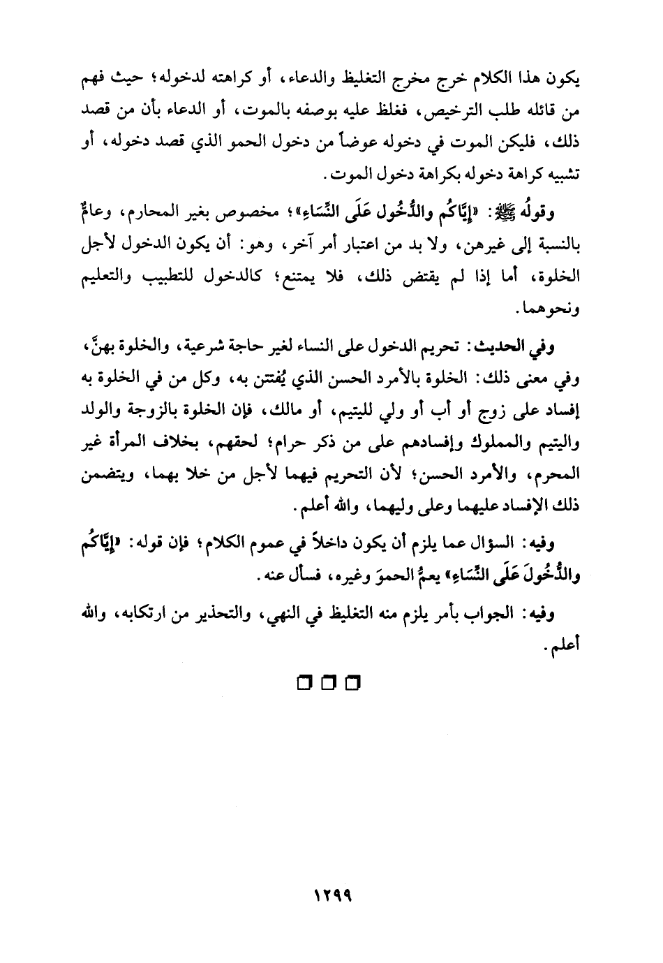 وقولُه - صلى الله عليه وسلم -: "إِيَّاكُم والدُّخُول عَلَى النِّسَاءِ"؛ مخصوص بغير المحارم، وعامٌّ بالنسبة إلى غيرهن، ولا بد من اعتبار أمر آخر، وهو: أن يكون الدخول لأجل الخلوة، أما إذا لم يقتض ذلك، فلا يمتنع؛ كالدخول للتطبيب والتعليم ونحوهما.