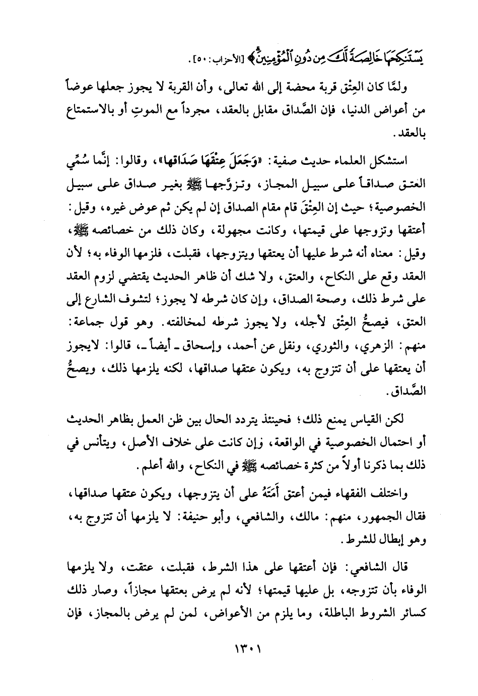 استشكل العلماء حديث صفية: "وَجَعَلَ عِتْقَهَا صَدَاقها"، وقالوا: إنَّما سُمِّي العتق صداقًا على سبيل المجاز، وتزوَّجها - صلى الله عليه وسلم - بغير صداق على سبيل الخصوصية؛ حيث إن العِتْقَ قام مقام الصداق إن لم يكن ثم عوض غيره، وقيل: أعتقها وتزوجها على قيمتها، وكانت مجهولة، وكان ذلك من خصائصه - صلى الله عليه وسلم -، وقيل: معناه أنه شرط عليها أن يعتقها ويتزوجها، فقبلت، فلزمها الوفاء به؛ لأن العقد وقع على النكاح، والعتق، ولا شك أن ظاهر الحديث يقتضي لزوم العقد على شرط ذلك، وصحة الصداق، وإن كان شرطه لا يجوز؛ لتشوف الشارع إلى العتق، فيصحُّ العِتْق لأجله، ولا يجوز شرطه لمخالفته. وهو قول جماعة: منهم: الزهري، والثوري، ونقل عن أحمد، وإسحاق -أيضًا-، قالوا: لا يجوز أن يعتقها على أن تتزوج به، ويكون عتقها صداقها، لكنه يلزمها ذلك، ويصحُّ الصداق.