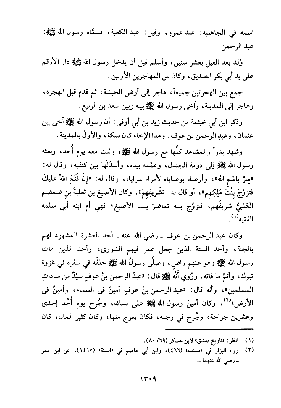 وكان عبد الرحمن بن عوف - رضي الله عنه - أحد العشرة المشهود لهم بالجنة، وأحد الستة الذين جعل عمر فيهم الشورى، وأحد الذين مات رسول الله - صلى الله عليه وسلم - وهو عنهم راضٍ، وصلَّى رسولُ الله - صلى الله عليه وسلم - خلفَه في سفره في غزوة تبوك، وأتمَّ ما فاته، ورُوي أَنَّه - صلى الله عليه وسلم - قال: "عبدُ الرحمن بنُ عوفِ سيِّدٌ من ساداتِ المسلمين"، وأنه قال: "عبد الرحمن بنُ عوفِ أمينٌ في السماء، وأمينٌ في الأرض" (¬2)، وكان أمينَ رسول الله - صلى الله عليه وسلم - على نسائه، وجُرح يوم أُحُد إحدى وعشرين جراحة، وجُرح في رجله، فكان يعرج منها، وكان كثير المال، كان
