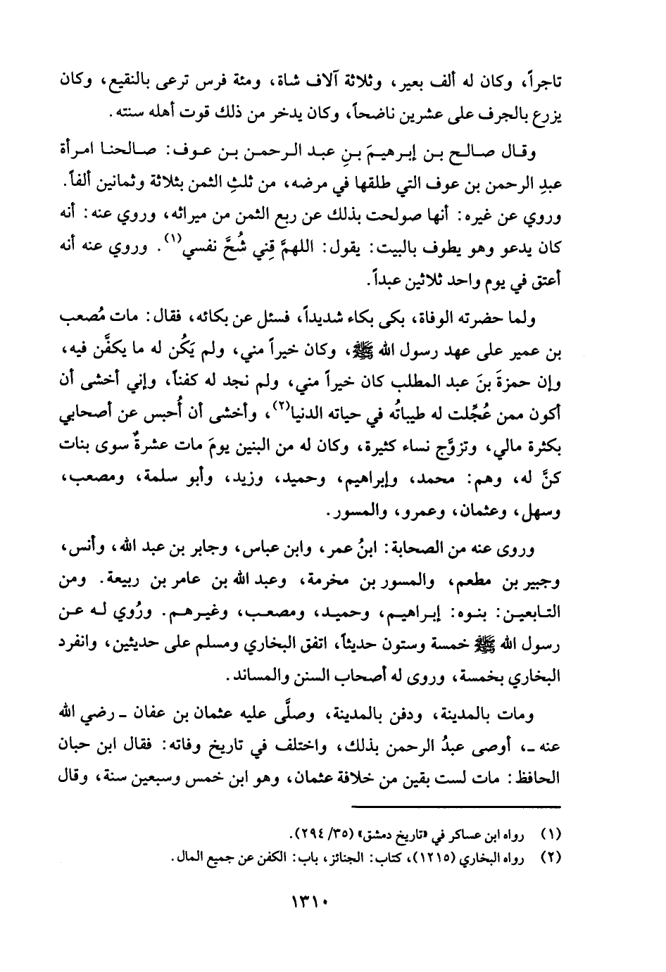 وقال صالح بن إبرهيمَ بنِ عبد الرحمن بن عوف: صالحنا امرأة عبدِ الرحمن بن عوف التي طلقها في مرضه، من ثلثِ الثمن بثلاثة وثمانين ألفًا. وروي عن غيره: أنها صولحت بذلك عن ربع الثمن من ميراثه، وروي عنه: أنه كان يدعو وهو يطوف بالبيت: يقول: اللهمَّ قِني شُحَّ نفسي (¬1). وروي عنه أنه أعتق في يوم واحد ثلاثين عبدًا.