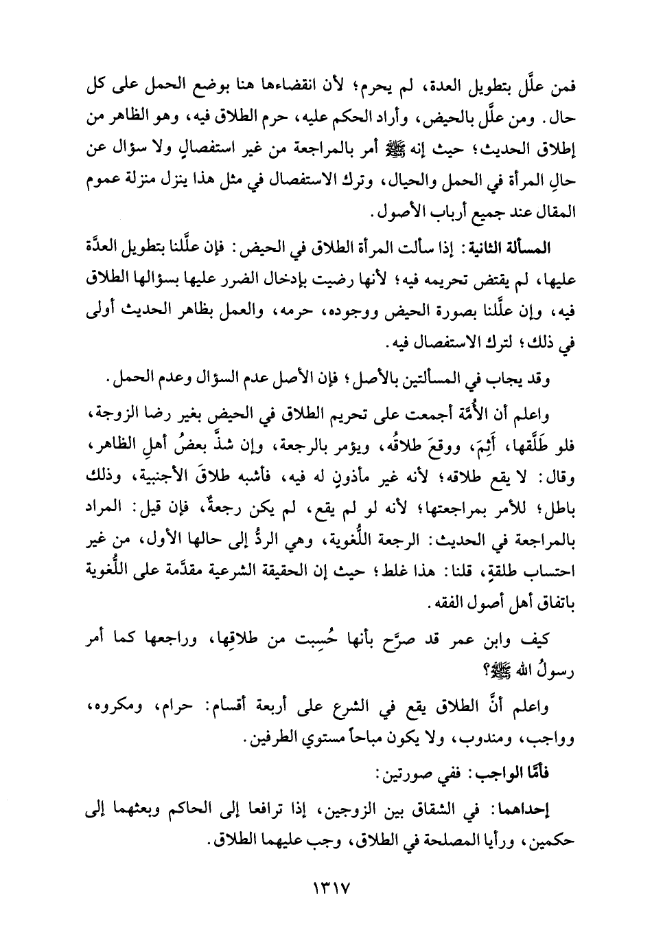 واعلم أن الطلاق يقع في الشرع على أربعة أقسام: حرام، ومكروه، وواجب، ومندوب، ولا يكون مباحًا مستوي الطرفين.