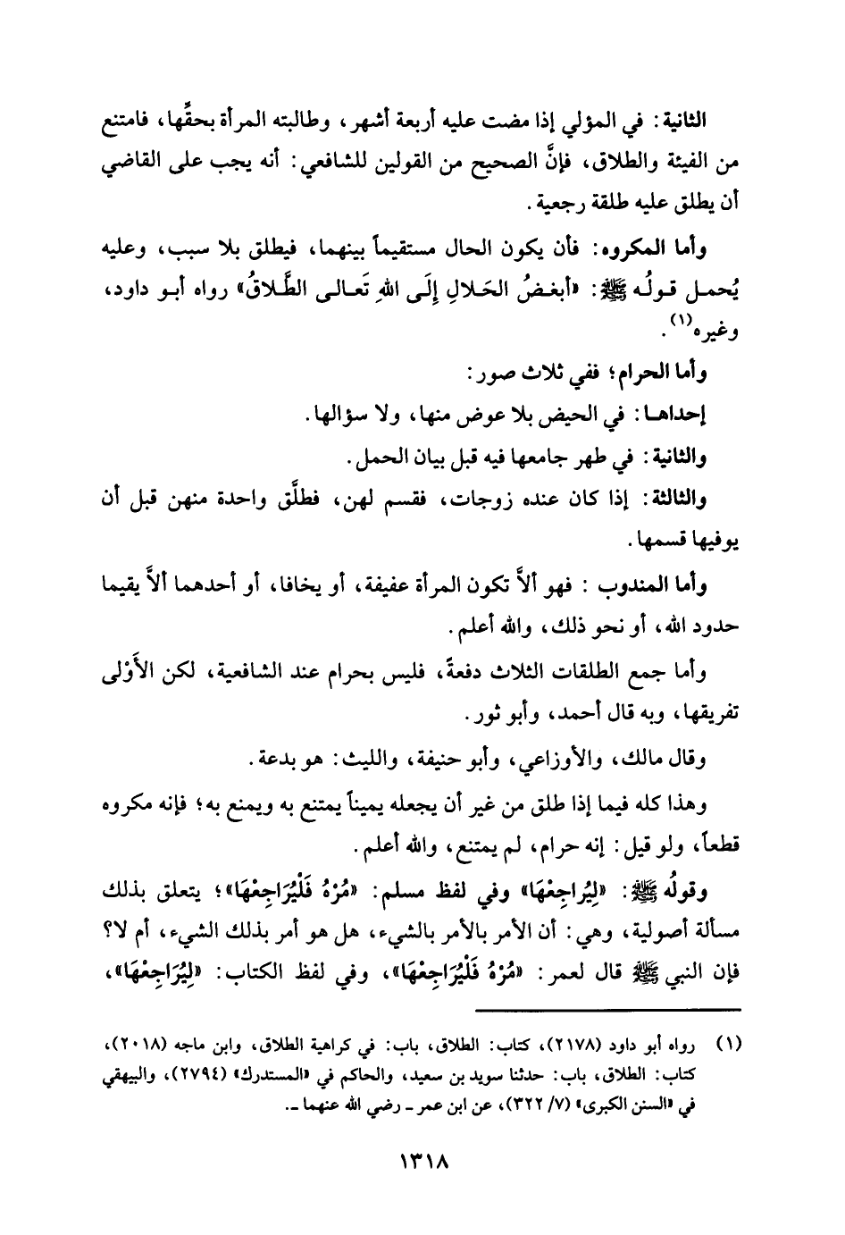 وأما المكروه: فإن يكون الحال مستقيمًا بينهما، فيطلق بلا سبب، وعليه يُحمل قولُه - صلى الله عليه وسلم -: "أبغضُ الحَلالِ إِلَى اللهِ تَعالى الطَّلاقُ " رواه أبو داود، وغيره (¬1).