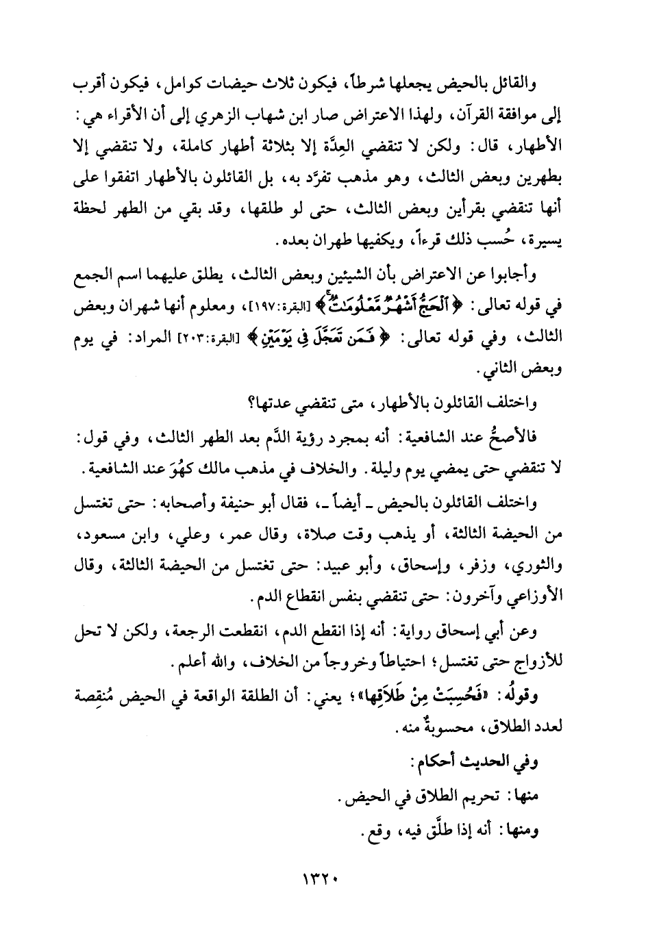 واختلف القائلون بالحيض -أيضًا-، فقال أبو حنيفة وأصحابه: حتى تغتسل من الحيضة الثالثة، أو يذهب وقت صلاة، وقال عمر، وعلي، وابن مسعود، والثوري , وزفر، وإسحاق، وأبو عبيد: حتى تغتسل من الحيضة الثالثة، وقال الأوزاعي وآخرون: حتى تنقضي بنفس انقطاع الدم.