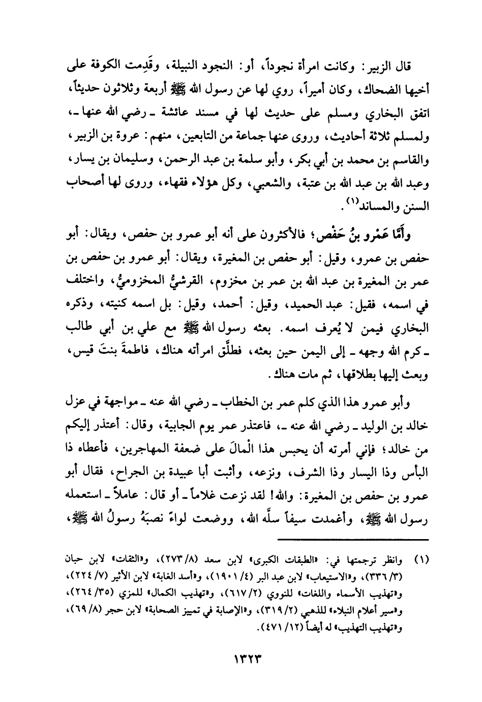 (¬1) وانظر ترجمتها في: "الطبفات الكبرى" لابن سعد (8/ 273)، و"الثقات" لابن حبان (3/ 336)، و"الاستيعاب" لابن عبد البر (4/ 1901)، و"أسد الغابة" لابن الأثير (7/ 224)، و"تهذيب الأسماء واللغات" للنووي (2/ 617)، و"تهذيب الكمال" للمزي (35/ 264)، و"سير أعلام النبلاء" للذهبي (2/ 319)، و"الإصابة في تمييز الصحابة" لابن حجر (8/ 69)، و"تهذيب التهذيب" له أيضًا (12/ 471).