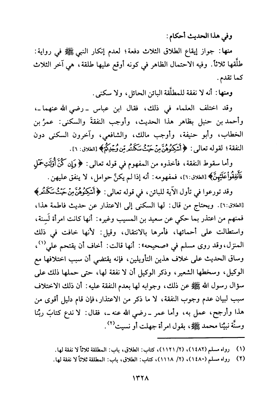 (¬2) رواه مسلم (1480)، (2/ 1118)، كتاب: الطلاق، باب: المطلقة ثلاثًا لا نفقة لها.
