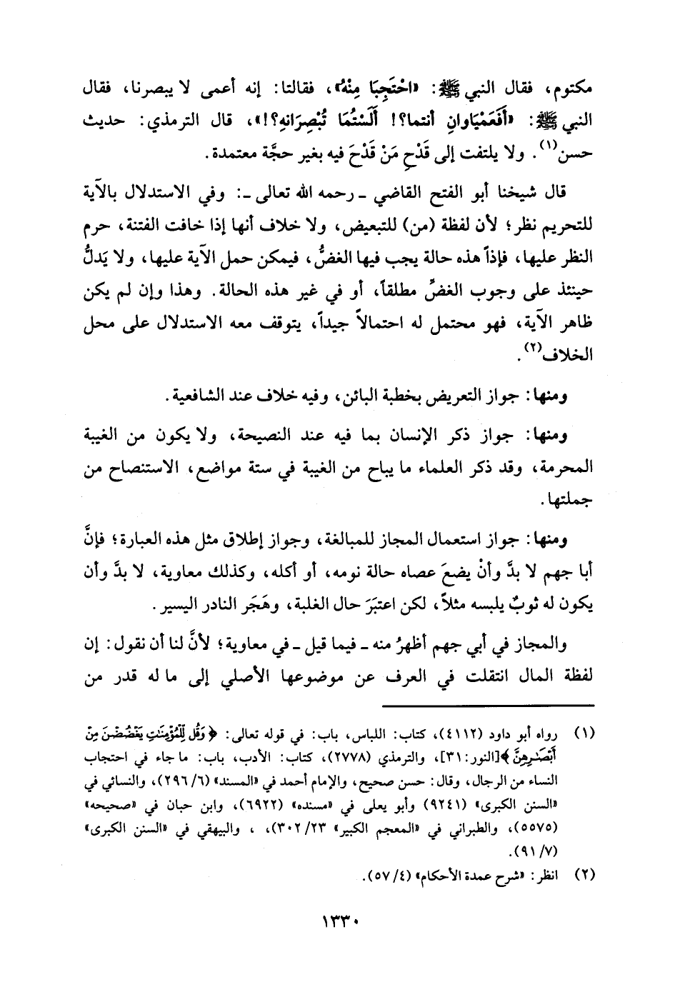 مكتوم، فقال النبي - صلى الله عليه وسلم -: "احْتَجِبَا مِنْهُ"، فقالتا: إنه أعمى لا يبصرنا، فقال النبي - صلى الله عليه وسلم -: "أفَعَمْيَاوانِ أنتما؟! ألَسْتُمَا تُبْصِرَانهِ؟! "، قال الترمذي: حديث حسن (¬1). ولا يلتفت إلى قَدْحِ مَنْ قَدْحَ فيه بغير حجَّة معتمدة.