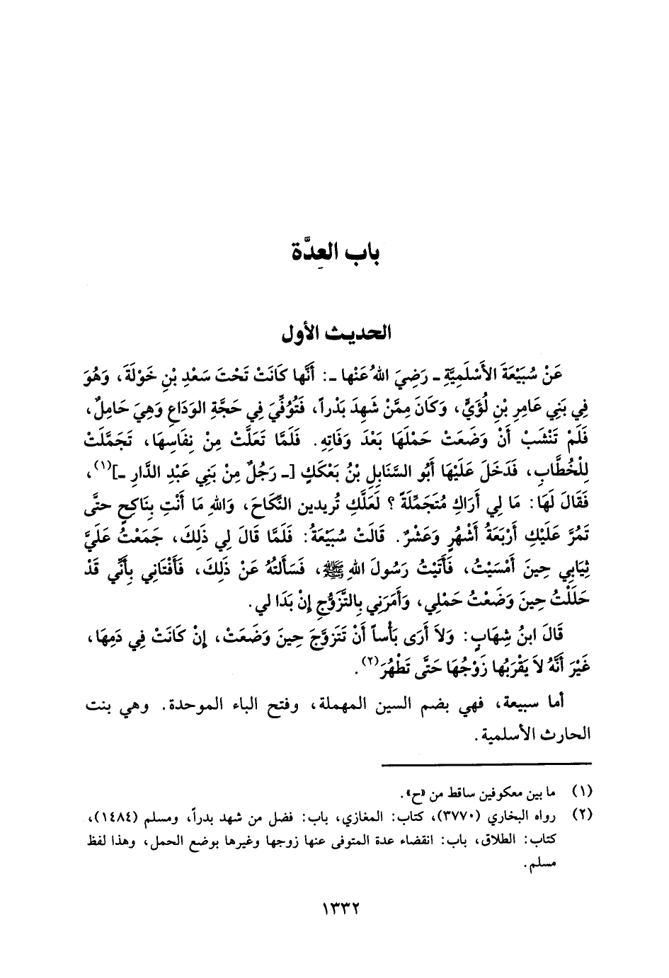 (¬2) رواه البخاري (3770)، كتاب: المغازي، باب: فضل من شهد بدرًا، ومسلم (1484)، كتاب: الطلاق، باب: انقضاء عدة المتوفى عنها زوجها وغيرها بوضع الحمل، وهذا لفظ مسلم.