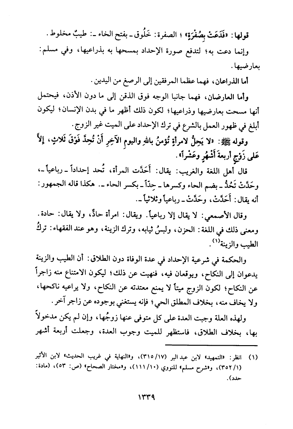 ومعنى ذلك في اللغة: الحزن، ولبسُ ثيابه، وترك الزينة، وهو عند الفقهاء: تركُ الطيب والزينة (¬1).