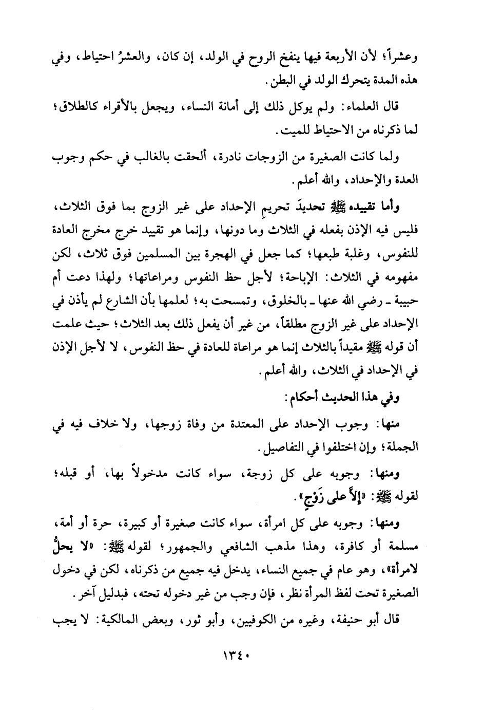 وأما تقييده - صلى الله عليه وسلم - تحديدَ تحريمِ الإحداد على غير الزوج بما فوق الثلاث، فليس فيه الإذن بفعله في الثلاث وما دونها، وإنما هو تقييد خرج مخرج العادة للنفوس، وغلبة طبعها؛ كما جعل في الهجرة بين المسلمين فوق ثلاث، لكن مفهومه في الثلاث: الإباحة؛ لأجل حظ النفوس ومراعاتها؛ ولهذا دعت أم حبيبة - رضي الله عنها - بالخلوق، وتمسحت به؛ لعلمها بأن الشارع لم يأذن في الإحداد على غير الزوج مطلقًا، من غير أن يفعل ذلك بعد الثلاث؛ حيث علمت أن قوله - صلى الله عليه وسلم - مقيدًا بالثلاث إنما هو مراعاة للعادة في حظ النفوس، لا لأجل الإذن في الإحداد في الثلاث، والله أعلم.
