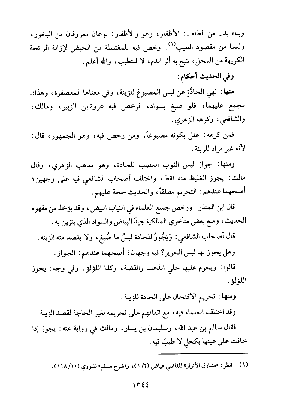 منها: نهي الحادَّةِ عن لبس المصبوغ للزينة، وفي معناها المعصفرة، وهذان مجمع عليهما، فلو صبغ بسواد، فرخص فيه عروة بن الزبير، ومالك، والشافعي، وكرهه الزهري.