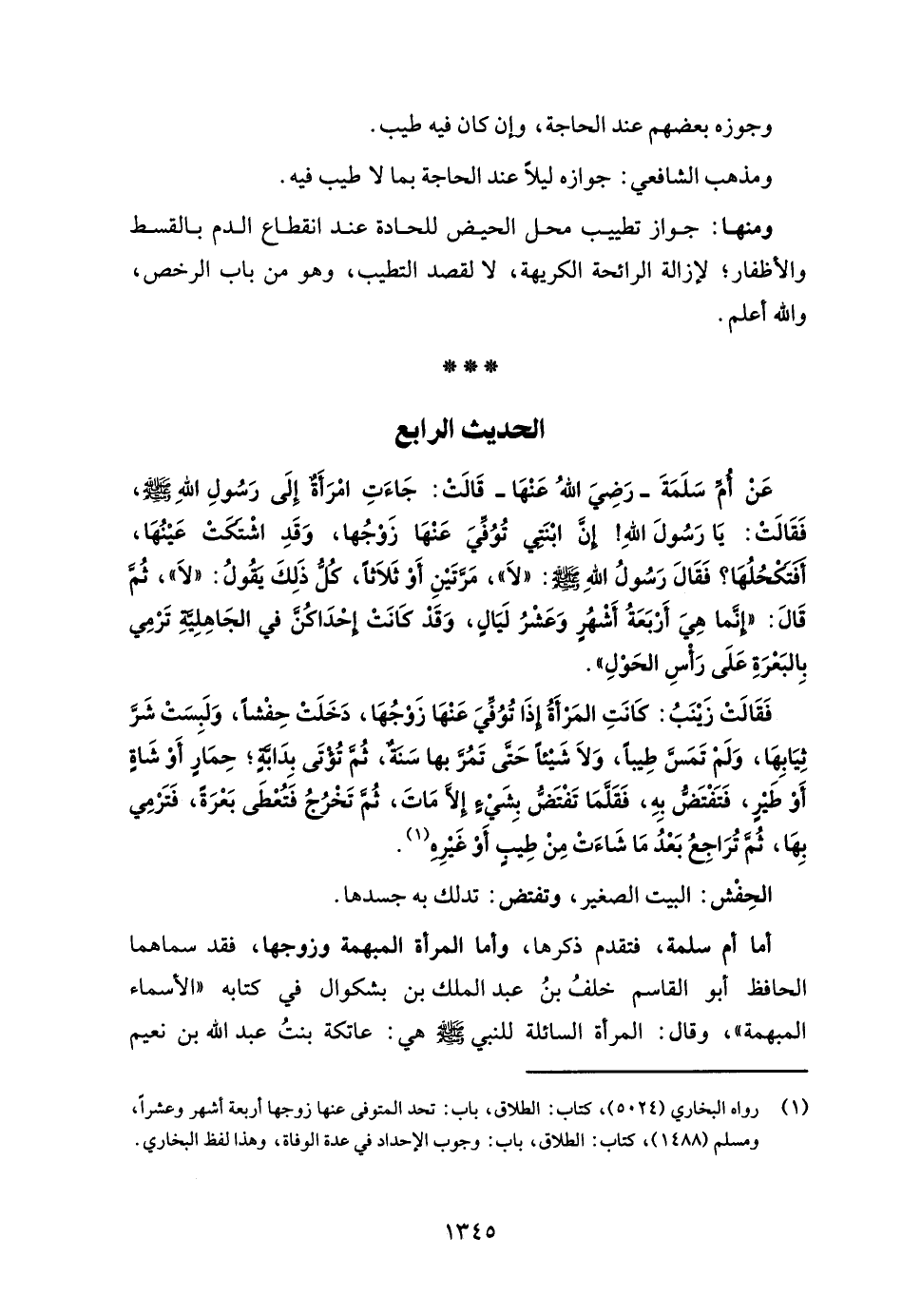 (¬1) رواه البخاري (5024)، كتاب: الطلاق، باب: تحد المتوفى عنها زوجها أربعة أشهر وعشرًا، ومسلم (1488)، كتاب: الطلاق، باب: وجوب الإحداد في عدة الوفاة، وهذا لفظ البخاري.