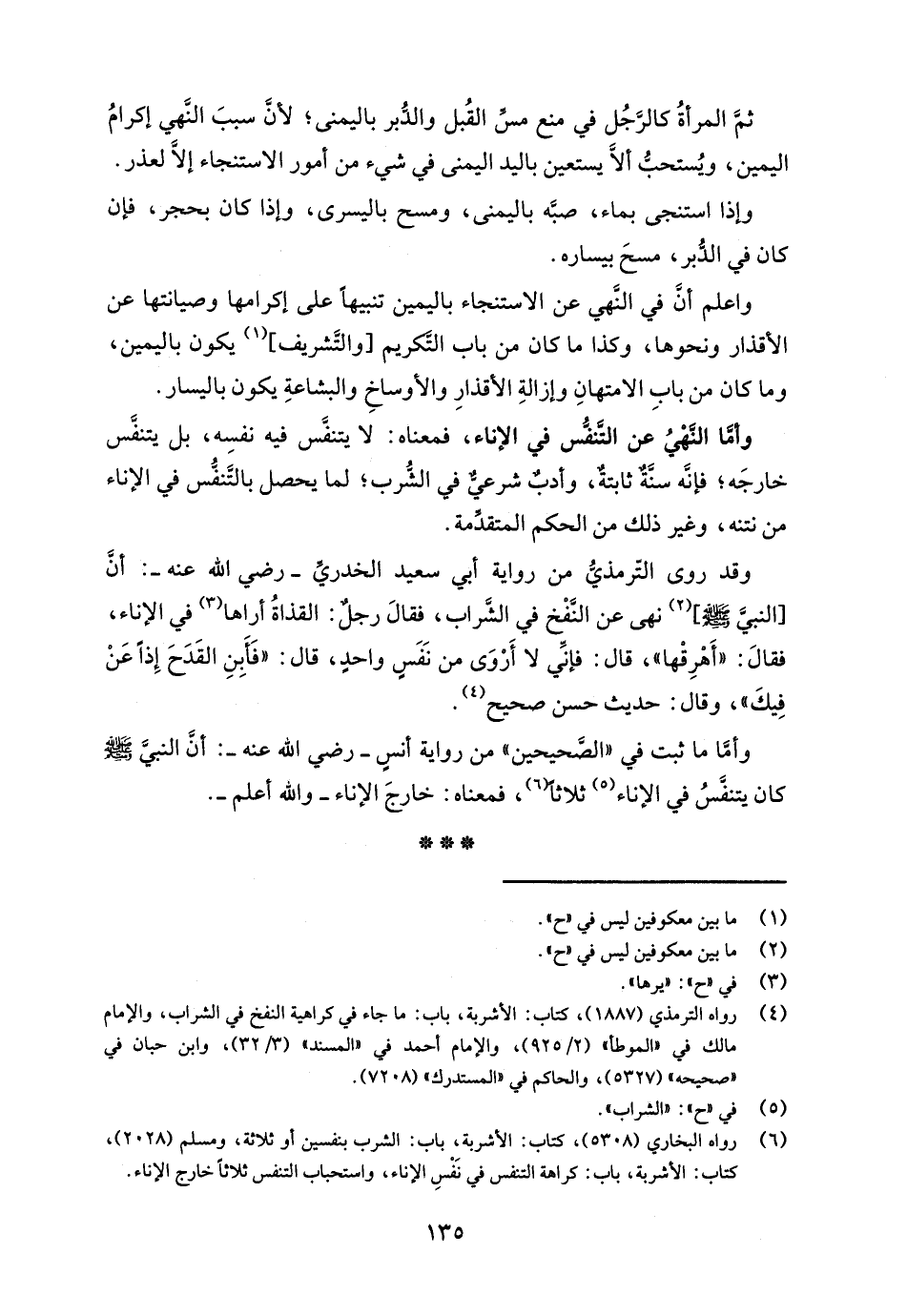 (¬6) رواه البخاري (5308)، كتاب: الأشربة، باب: الشرب بنفسين أو ثلاثة، ومسلم (2028)، كتاب: الأشربة، باب: كراهة التنفس في نَفْسِ الإناء، واستحباب التنفس ثلاثًا خارج الإناء.