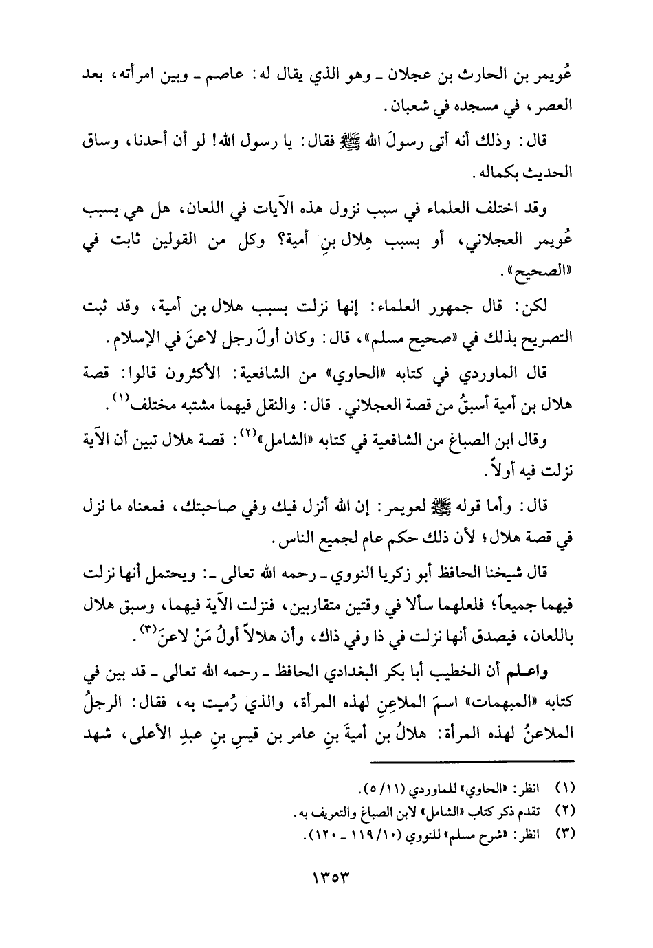 قال شيخنا الحافظ أبو زكريا النووي -رحمه الله تعالى-: ويحتمل أنها نزلت فيهما جميعًا؛ فلعلهما سألا في وقتين متقاربين، فنزلت الآية فيهما، وسبق هلال باللعان، فيصدق أنها نزلت في ذا وفي ذاك، وأن هلالًا أولُ مَنْ لاعنَ (¬3).