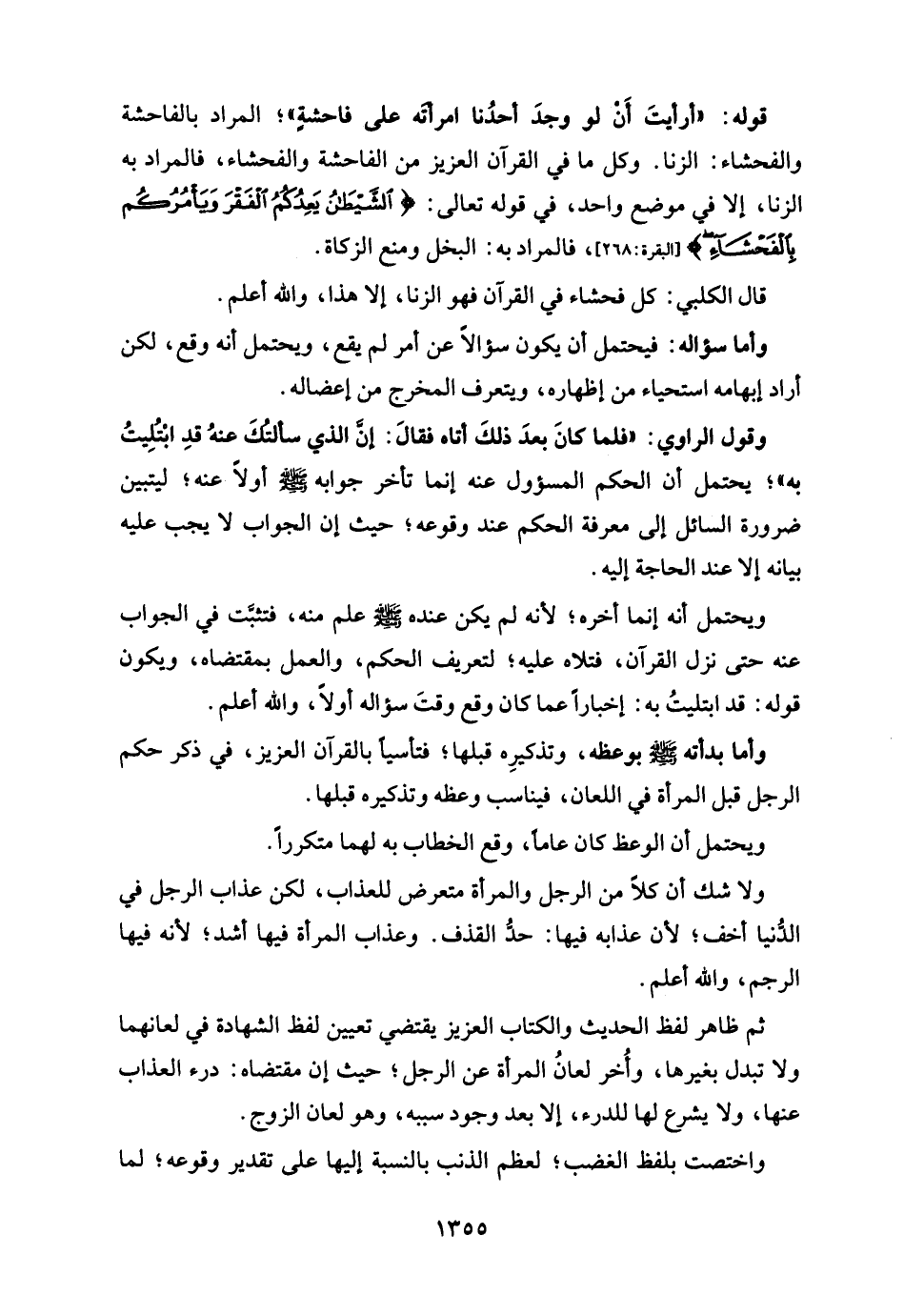 قوله: "أرأيتَ أَن لو وجدَ أحدُنا امرأتَه على فاحشةٍ"؛ المراد بالفاحشة والفحشاء: الزنا. وكل ما في القرآن العزيز من الفاحشة والفحشاء، فالمراد به الزنا، إلا في موضع واحد، في قوله تعالى: {الشَّيْطَانُ يَعِدُكُمُ الْفَقْرَ وَيَأْمُرُكُمْ بِالْفَحْشَاءِ} [البقرة: 268]، فالمراد به: البخل ومنع الزكاة.
