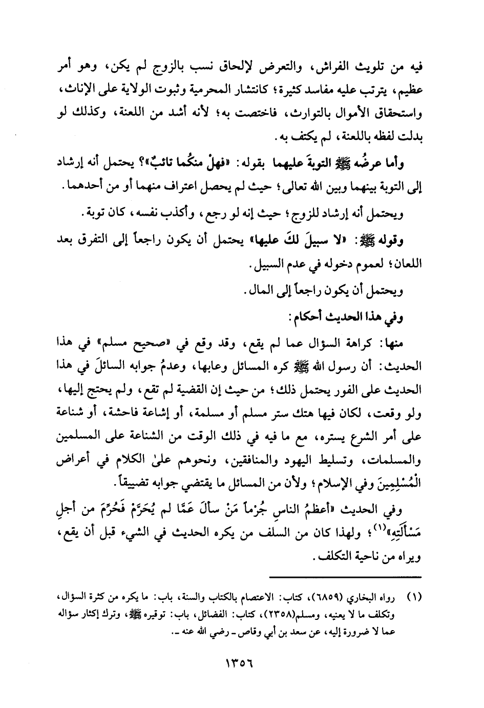 (¬1) رواه البخاري (6859)، كتاب: الاعتصام بالكتاب والسنة، باب: ما يكره من كثرة السؤال، وتكلف ما لا يعنيه، ومسلم (2358)، كتاب: الفضائل، باب: توقيره - صلى الله عليه وسلم -، وترك إكثار سؤاله عما لا ضرورة إليه، عن سعد بن أبي وقاص - رضي الله عنه -.