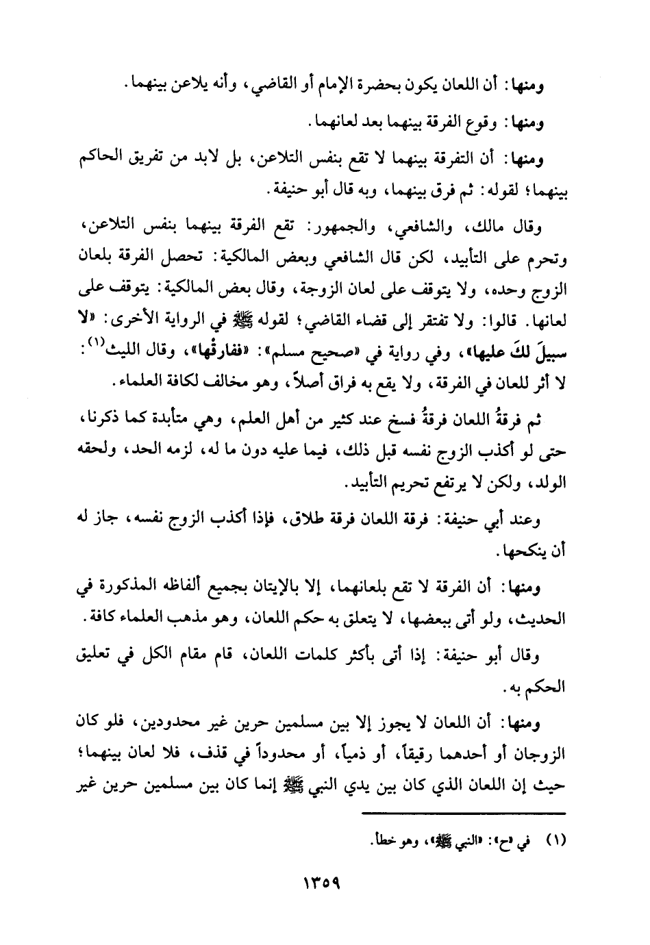 ومنها: أن الفرقة لا تقع بلعانهما، إلا بالإيتان بجميع ألفاظه المذكورة في الحديث، ولو أتى ببعضها، لا يتعلق به حكم اللعان، وهو مذهب العلماء كافة.