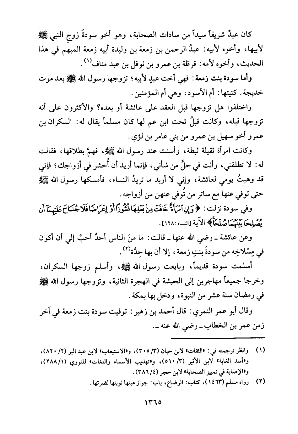 وكانت امرأة ثقيلة ثبطة، وأسنت عند رسول الله - صلى الله عليه وسلم -، فهمَّ بطلاقها، فقالت له: لا تطلقني، وأنت في حلٍّ من شأني، فإنما أريد أن أُحشر في أزواجك؛ فإني قد وهبتُ يومي لعائشة، وإني لا أريد ما تريدُ النساء، فأمسكها رسول الله - صلى الله عليه وسلم - حتى توفي عنها مع سائر من تُوفي عنهن من أزواجه.