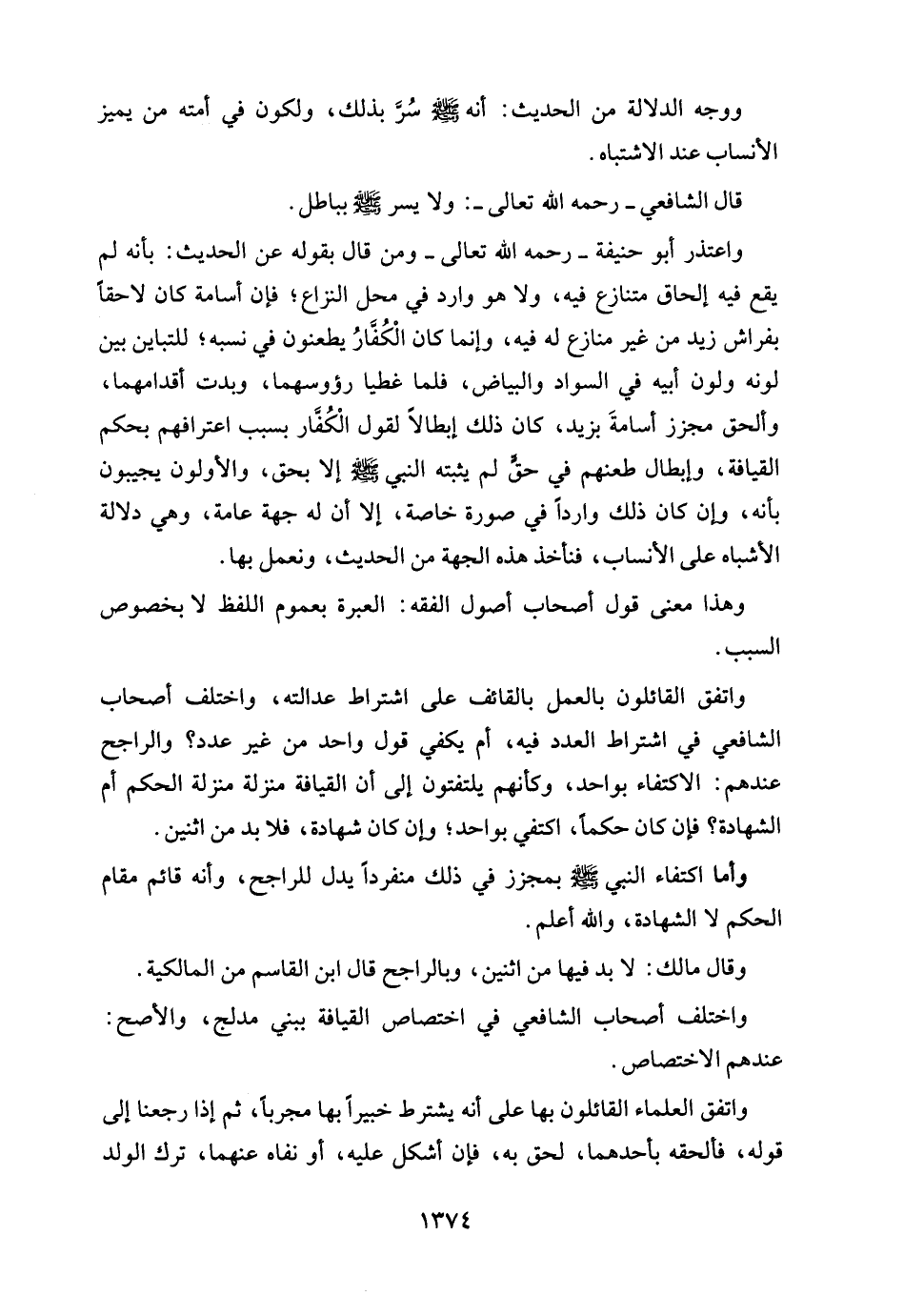 واعتذر أبو حنيفة -رحمه الله تعالى- ومن قال بقوله عن الحديث: بأنه لم يقع فيه إلحاق متنازع فيه، ولا هو وارد في محل النزاع؛ فإن أسامة كان لاحقًا بفراش زيد من غير منازع له فيه، وإنما كان الْكُفَّارُ يطعنون في نسبه؛ للتباين بين لونه ولون أبيه في السواد والبياض، فلما غطيا رؤوسهما، وبدت أقدامهما، وألحق مجزز أسامةَ بزيد، كان ذلك إبطالًا لقول الْكُفَّار بسبب اعترافهم بحكم القيافة، وإبطال طعنهم في حقٍّ لم يثبته النبي - صلى الله عليه وسلم - إلا بحق، والأولون يجيبون بأنه، وإن كان ذلك واردًا في صورة خاصة، إلا أن له جهة عامة، وهي دلالة الأشباه على الأنساب، فنأخذ هذه الجهة من الحديث، ونعمل بها.