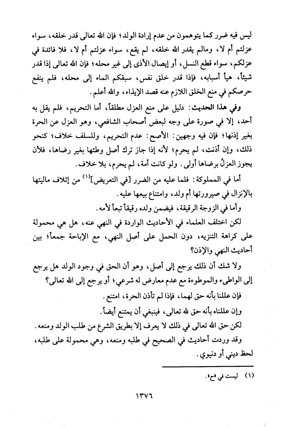 ليس فيه ضرر كما يتوهمون من عدم إرادة الولد؛ فإن الله تعالى قدر خلقه، سواء عزلتم أم لا، وما لم يقدر الله خلقه، لم يقع، سواء عزلتم أم لا، فلا فائدة في عزلكم، سواء قطع النسل، أو إيصال الأذى إلى غير محله؛ فإن الله تعالى إذا قدر شيئًا، هيأ أسبابه، فإذا قدر خلق نفس، سبقكم الماء إلى محله، فلم ينفع حرصكم في منع الخلق اللازم عنه قصد الإيذاء، والله أعلم.