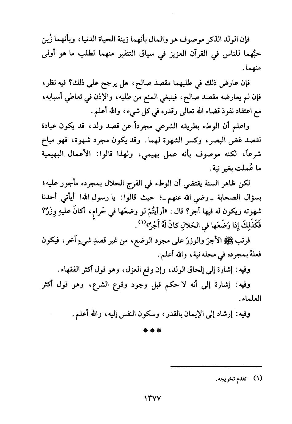 لكن ظاهر السنة يقتضي أن الوطء في الفرج الحلال بمجرده مأجور عليه؛ بسؤال الصحابة -رضي الله عنهم-؛ حيث قالوا: يا رسول الله! أيأتي أحدنا شهوته ويكون له فيها أجر؟ قال: "أرأيتُمْ لو وضعَها في حَرامٍ، أكانَ عليهِ وِزْرٌ؟ فَكَذَلِكَ إِذا وَضَعَها في الحَلالِ كانَ لَهُ أَجْرٌ" (¬1).