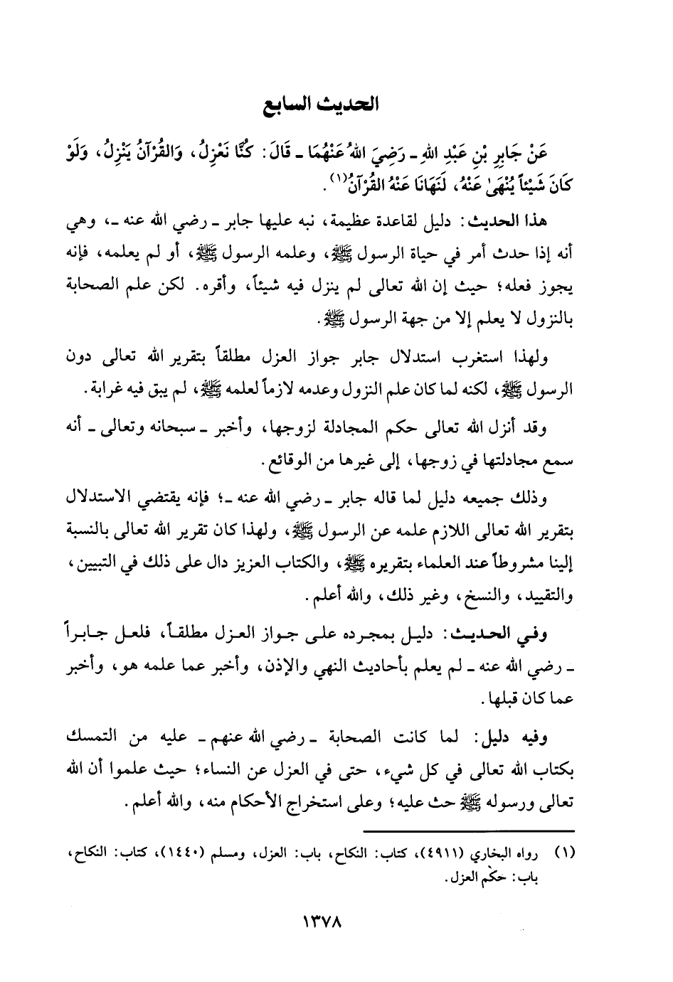 هذا الحديث: دليل لقاعدة عظيمة، نبه عليها جابر - رضي الله عنه -، وهي أنه إذا حدث أمر في حياة الرسول - صلى الله عليه وسلم -، وعلمه الرسول - صلى الله عليه وسلم -، أو لم يعلمه، فإنه يجوز فعله؛ حيث إن الله تعالى لم ينزل فيه شيئًا، وأقره. لكن علم الصحابة بالنزول لا يعلم إلا من جهة الرسول - صلى الله عليه وسلم -.