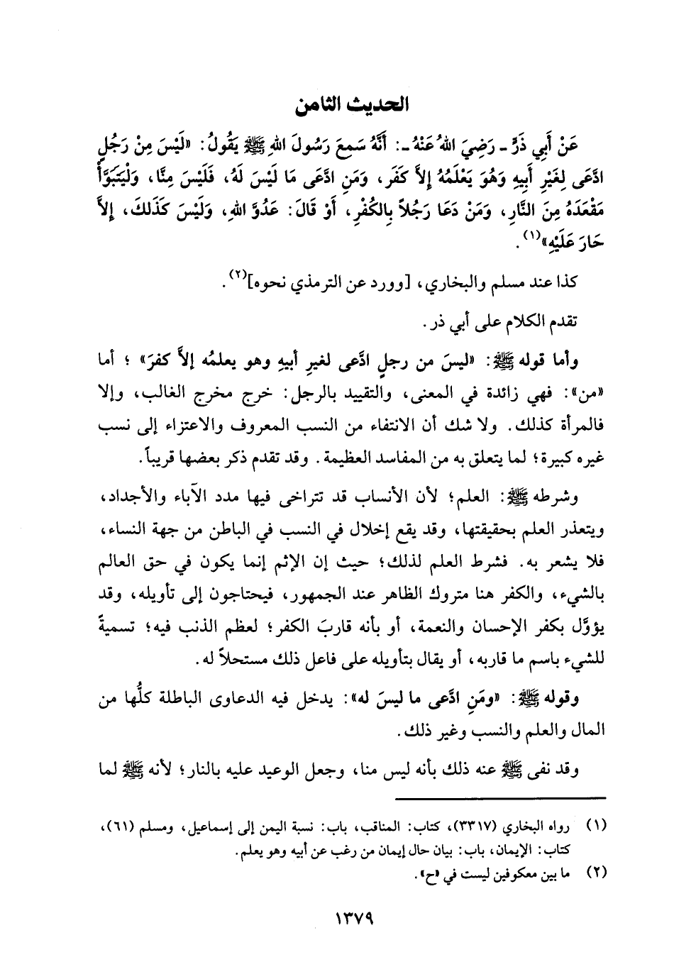 عَنْ أَبِي ذَرٍّ -رَضِيَ اللهُ عَنْهُ-: أَنَّهُ سَمعَ رَسُولَ اللهِ - صلى الله عليه وسلم - يَقُولُ: "لَيْسَ مِنْ رَجُلٍ ادَّعَى لِغَيْرِ أَبيهِ وَهُوَ يَعْلَمُهُ إِلَّا كَفَر، وَمَنِ ادَّعَى مَا لَيْسَ لَهُ، فَلَيْسَ مِنَّا، وَلْيَتَبَوَّأْ مَقْعَدَهُ مِنَ النَّارِ، وَمَنْ دَعَا رَجُلًا بِالكُفْرِ، أَوْ قَالَ: عَدُوَّ اللهِ، وَلَيْسَ كَذَلكَ، إلا حَارَ عَلَيْهِ" (¬1).