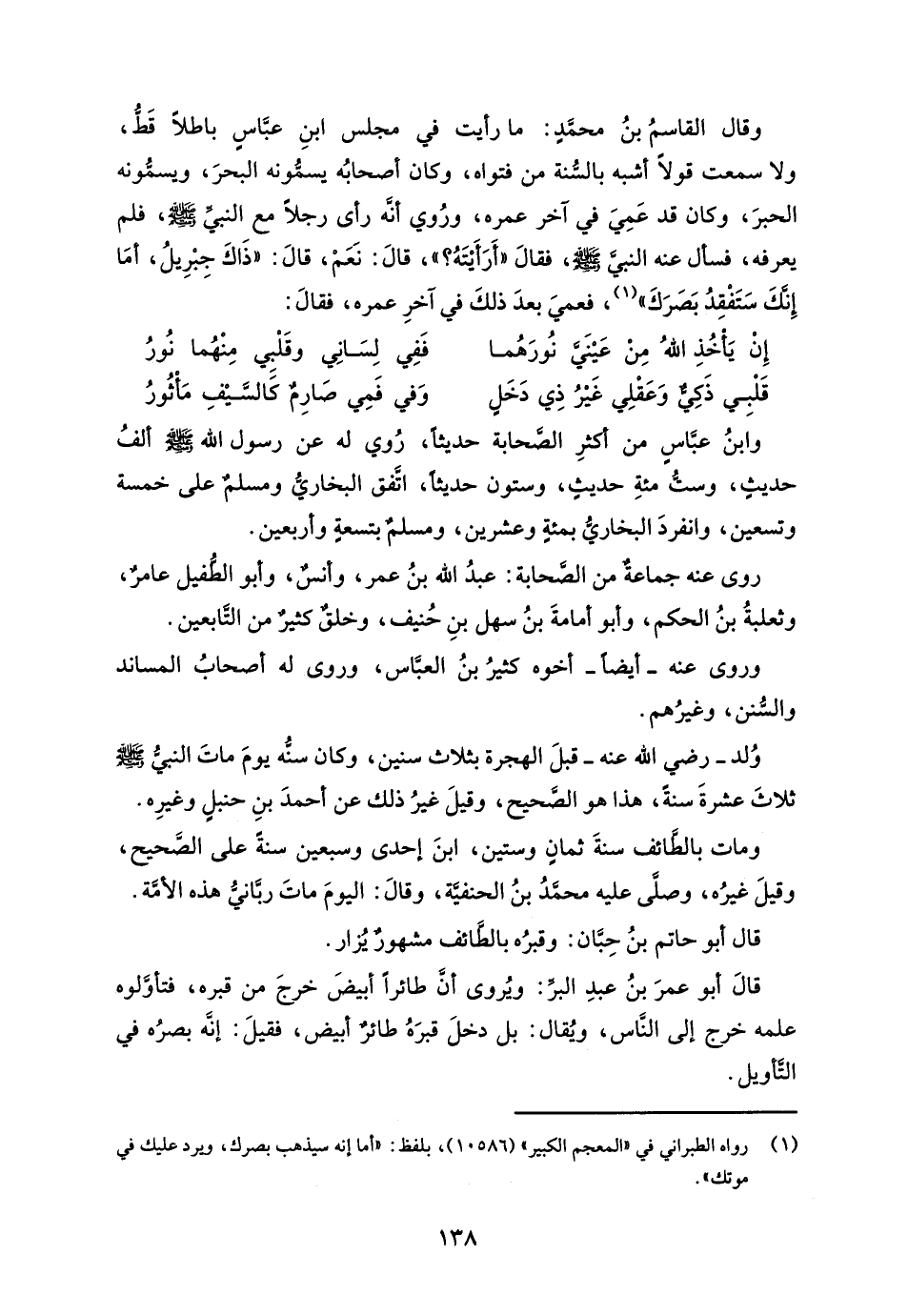 وقال القاسمُ بنُ محمدٍ: ما رأيت في مجلس ابنِ عباسٍ باطلًا قَطُّ، ولا سمعت قولًا أشبه بالسُّنة من فتواه، وكان أصحابُه يسمُّونه البحرَ، ويسمونه الحبرَ، وكان قد عَمِيَ في آخر عمره، ورُوي أنه رأى رجلًا مع النبي - صلى الله عليه وسلم -، فلم يعرفه، فسأل عنه النبي - صلى الله عليه وسلم -، فقالَ "أَرَأَيْتَهُ؟ "، قالَ: نَعَمْ، قالَ: "ذَاكَ جِبْرِيلُ، أمَّا إِنك سَتَفْقِدُ بَصَرَكَ" (¬1)، فعميَ بعدَ ذلكَ في آخرِ عمره، فقالَ: