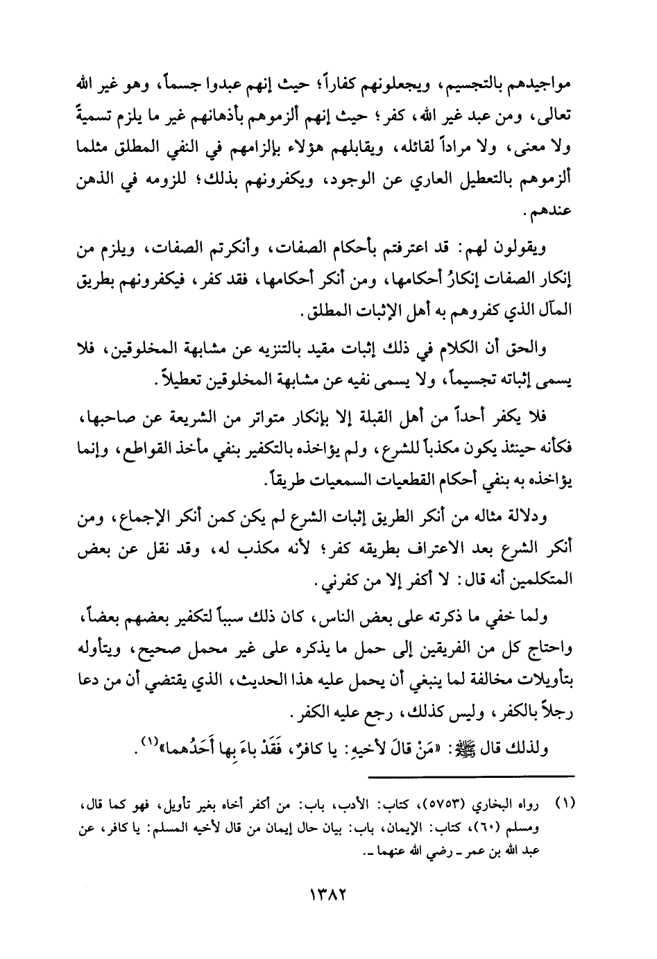ولما خفي ما ذكرته على بعض الناس، كان ذلك سببًا لتكفير بعضهم بعضًا، واحتاج كل من الفريقين إلى حمل ما يذكره على غير محمل صحيح، ويتأوله بتأويلات مخالفة لما ينبغي أن يحمل عليه هذا الحديث، الذي يقتضي أن من دعا رجلًا بالكفر، وليس كذلك، رجع عليه الكفر.