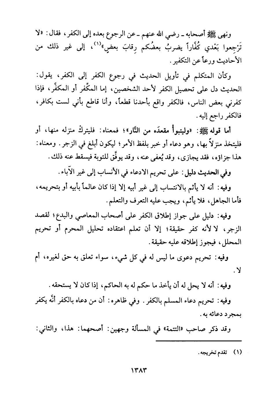 ونهى - صلى الله عليه وسلم - أصحابه -رضي الله عنهم- عن الرجوع بعده إلى الكفر، فقال: "لا تَرْجِعوا بَعْدي كُفَّارًا يضربُ بعضُكم رِقابَ بعضٍ" (¬1)، إلى غير ذلك من الأحاديث ورعًا عن التكفير.