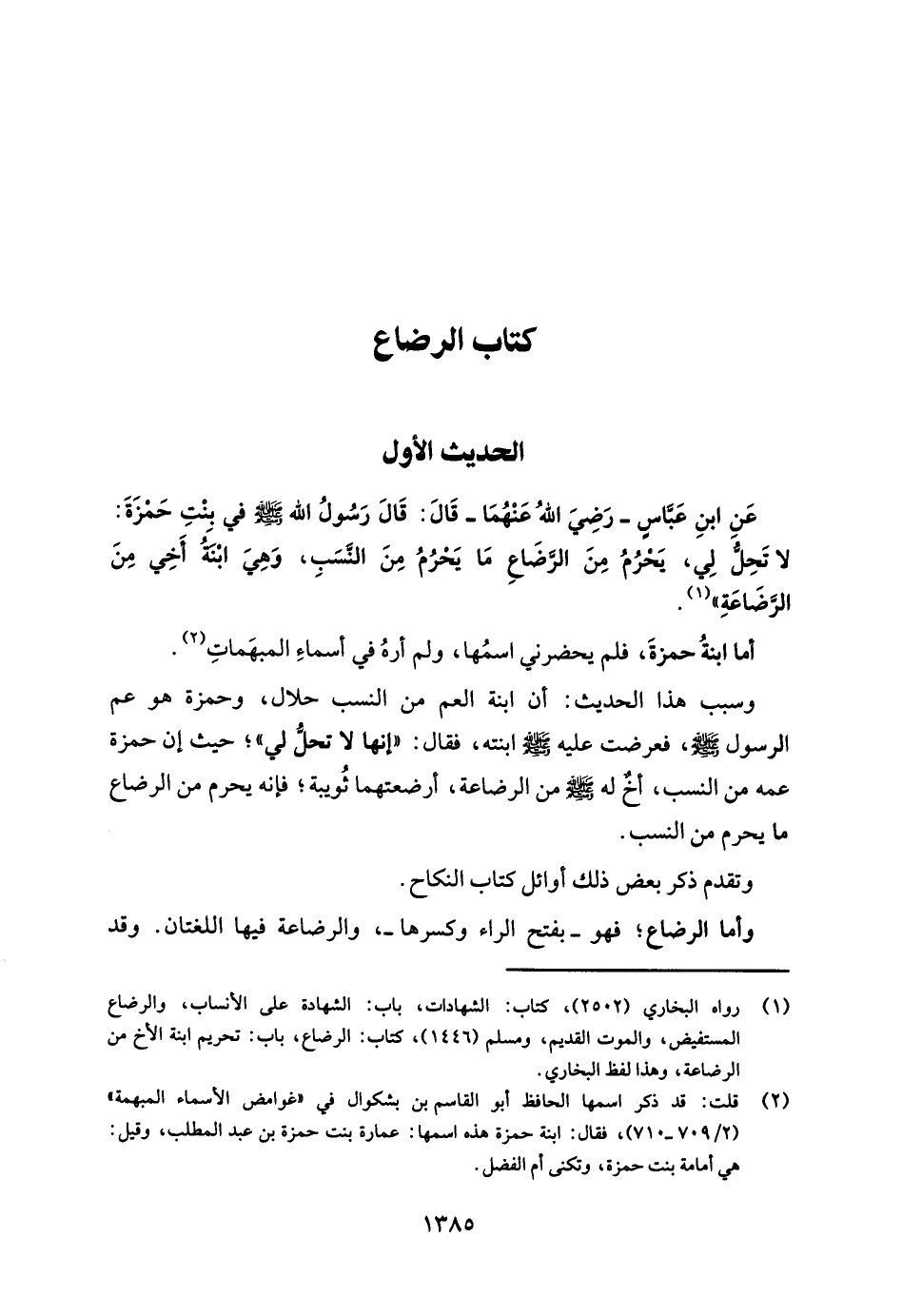 عَن ابنِ عَبَّاسٍ -رَضِيَ اللهُ عَنْهُمَا- قَالَ: قَالَ رَسُولُ الله - صلى الله عليه وسلم - في بِنْتِ حَمْزَةَ: لا تَحِلُّ لِي، يَحْرُمُ مِنَ الرَّضَاعِ مَا يَحْرُمُ مِنَ النَّسَبِ، وَهِيَ ابْنَهُ أَخِي مِنَ الرَّضَاعَةِ" (¬1).