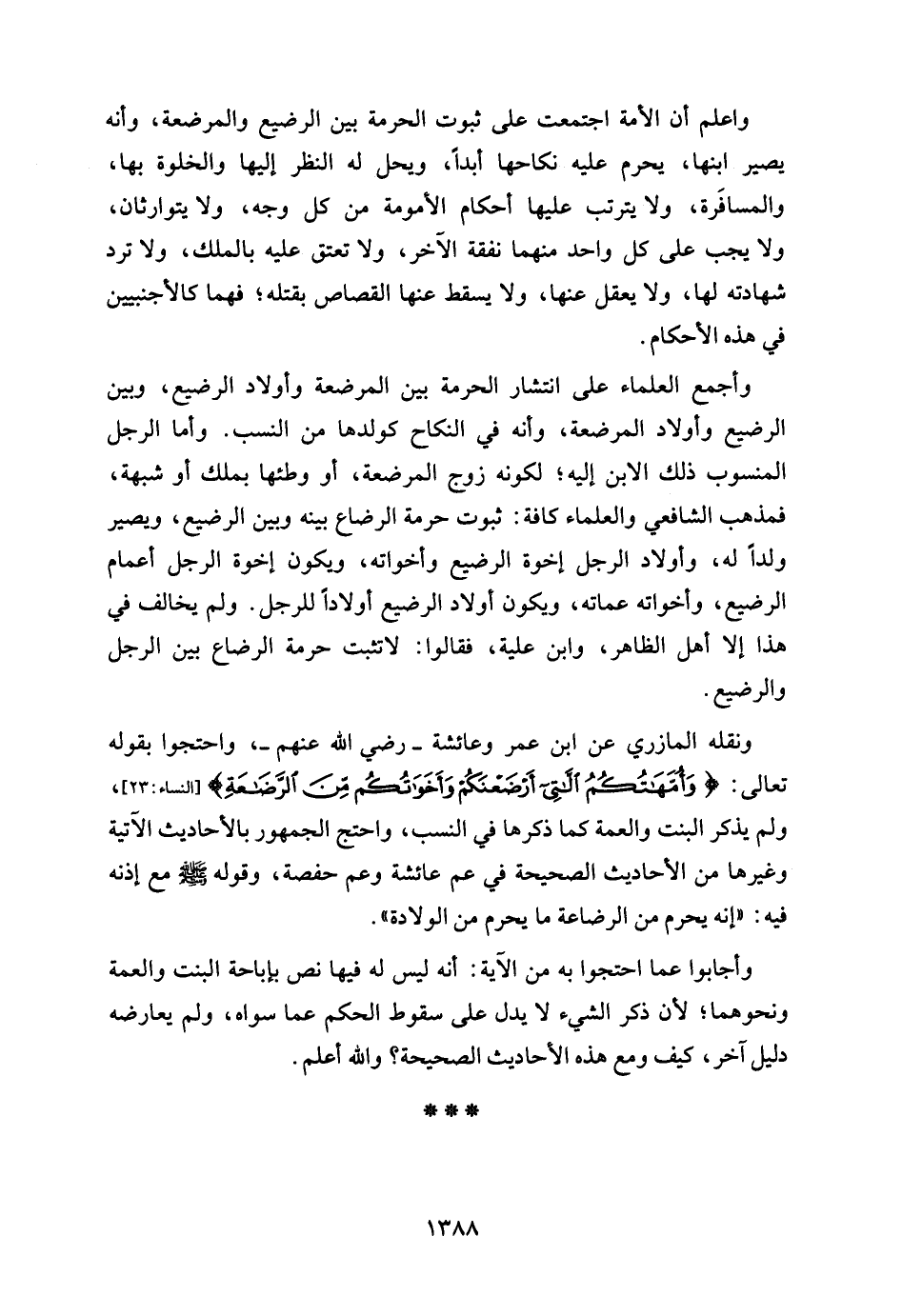 واعلم أن الأمة اجتمعت على ثبوت الحرمة بين الرضيع والمرضعة، وأنه يصير ابنها، يحرم عليه نكاحها أبدًا، ويحل له النظر إليها والخلوة بها، والمسافَرة، ولا يترتب عليها أحكام الأمومة من كل وجه، ولا يتوارثان، ولا يجب على كل واحد منهما نفقة الآخر، ولا تعتق عليه بالملك، ولا ترد شهادته لها، ولا يعقل عنها، ولا يسقط عنها القصاص بقتله؛ فهما كالأجنبيين في هذه الأحكام.