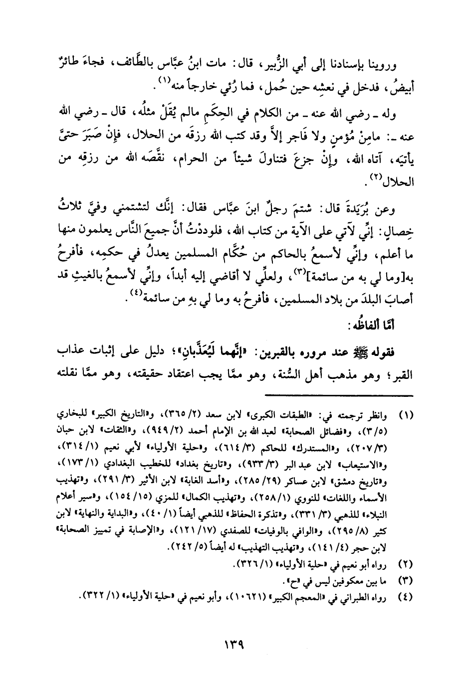 فقوله - صلى الله عليه وسلم - عند مروره بالقبرين: "إنهما لَيُعَذَّبانِ"؛ دليل على إثبات عذاب القبر؛ وهو مذهب أهل السنة، وهو مما يجب اعتقاد حقيقته، وهو مما نقلته
