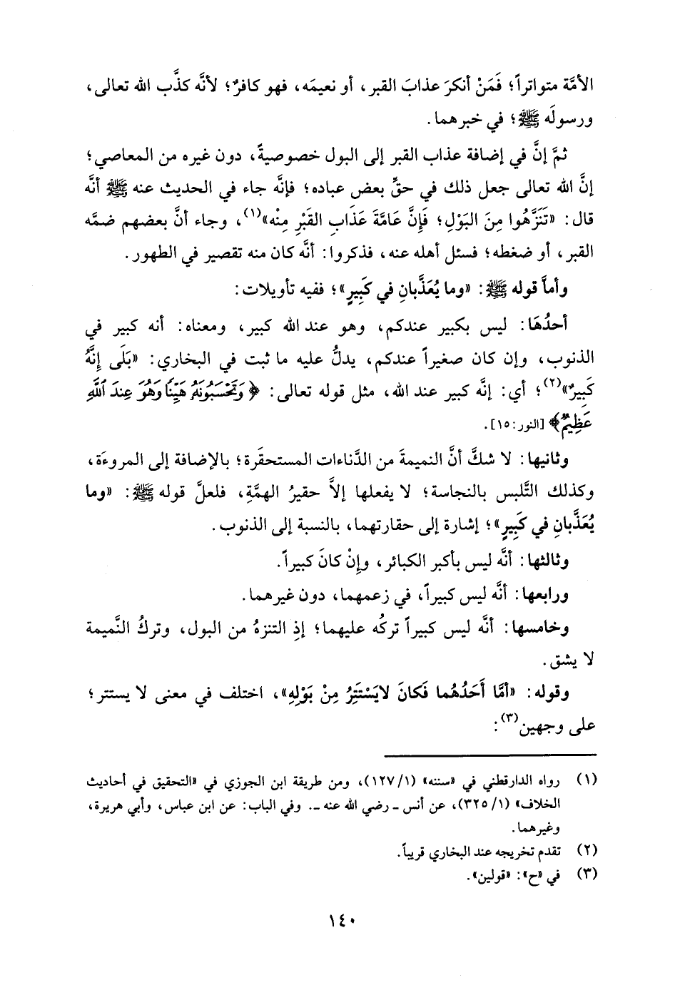 الأمة متواترًا؛ فَمَنْ أنكرَ عذابَ القبر، أو نعيمَه، فهو كافرٌ؛ لأنه كذَّب الله تعالى، ورسولَه - صلى الله عليه وسلم -؛ في خبرهما.