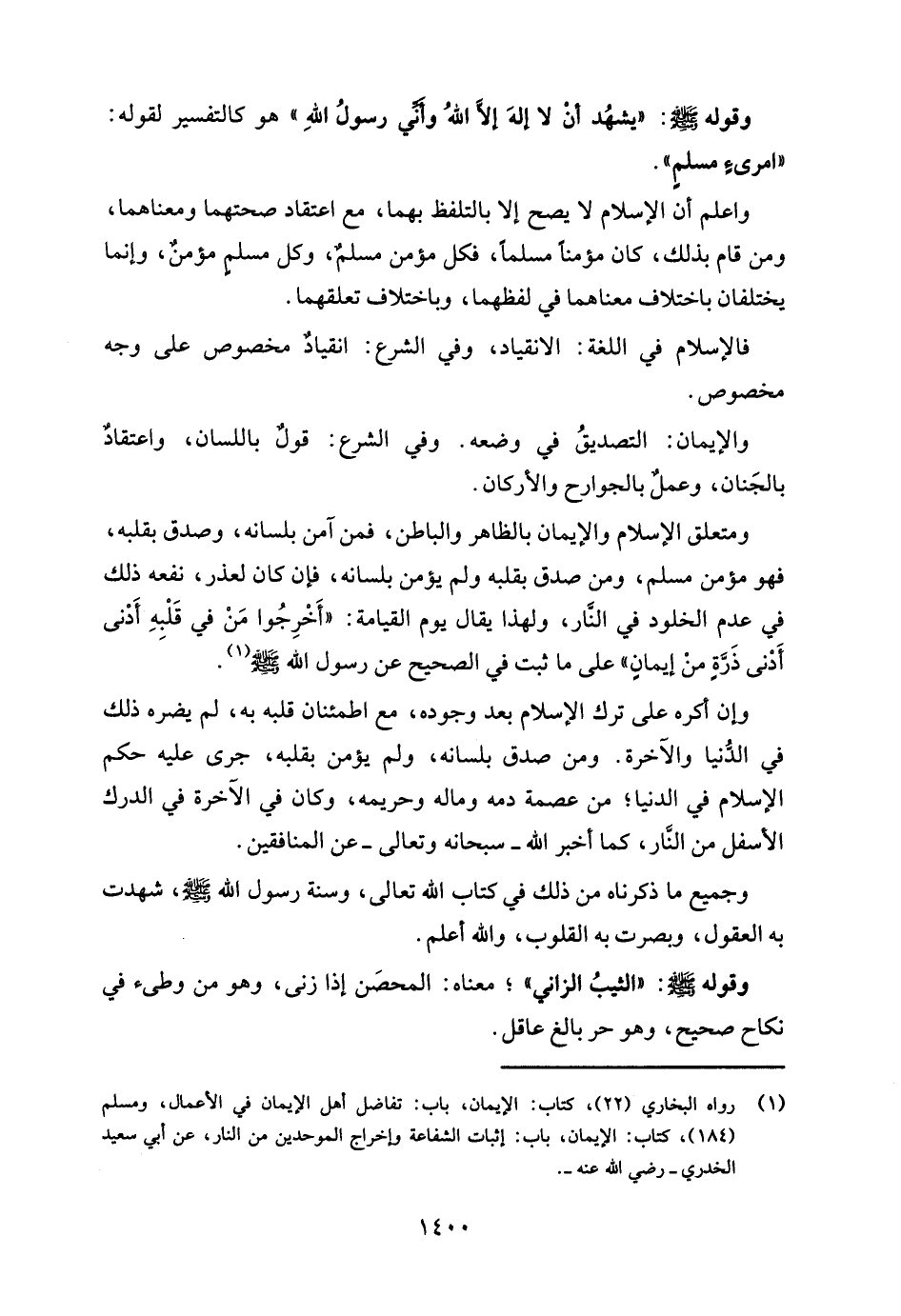 واعلم أن الإسلام لا يصح إلا بالتلفظ بهما، مع اعتقاد صحتهما ومعناهما، ومن قام بذلك، كان مؤمنًا مسلمًا، فكل مؤمن مسلمٌ، وكل مسلمٍ مؤمنٌ، وإنما يختلفان باختلاف معناهما في لفظهما، وباختلاف تعلقهما.