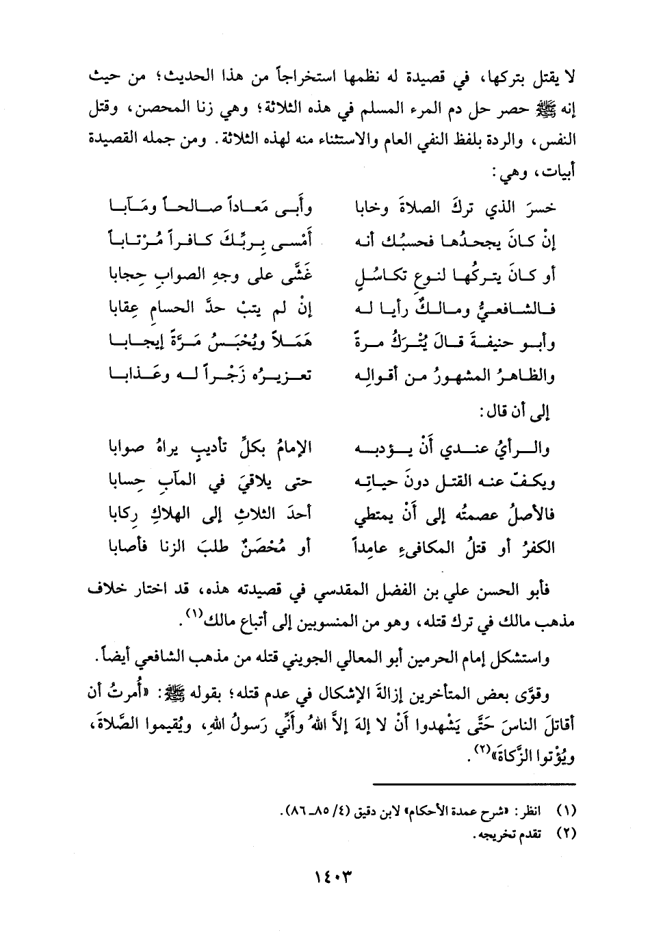 لا يقتل بتركها، في قصيدة له نظمها استخراجًا من هذا الحديث؛ من حيث إنه - صلى الله عليه وسلم - حصر حل دم المرء المسلم في هذه الثلاثة؛ وهي زنا المحصن، وقتل النفس، والردة بلفظ النفي العام والاستثناء منه لهذه الثلاثة. ومن جمله القصيدة أبيات، وهي: