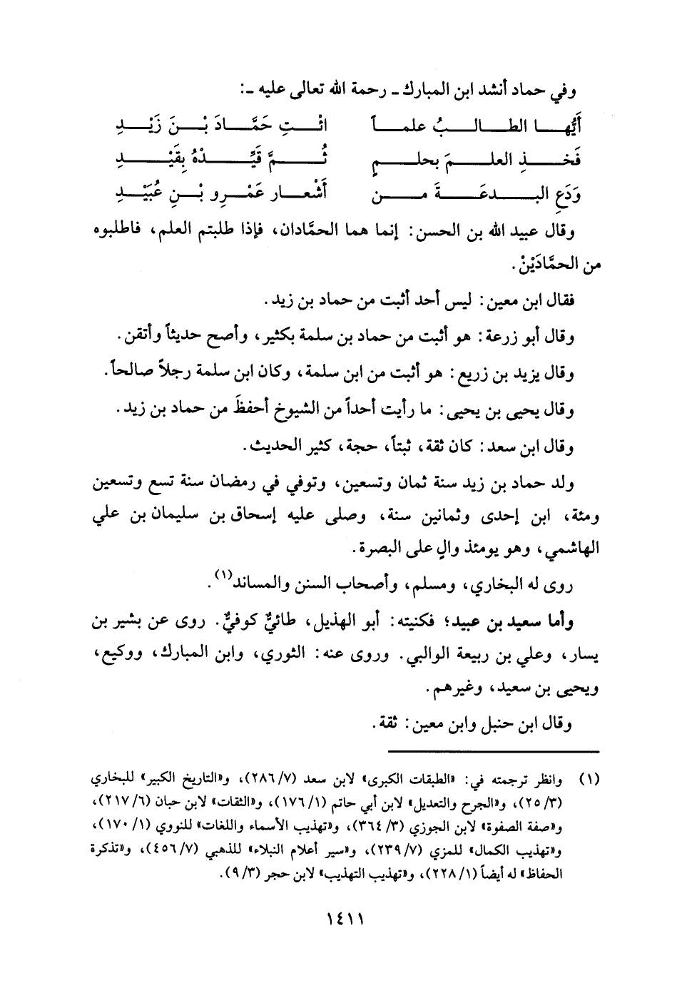 وفي حماد أنشد ابن المبارك -رحمة الله تعالى عليه-: