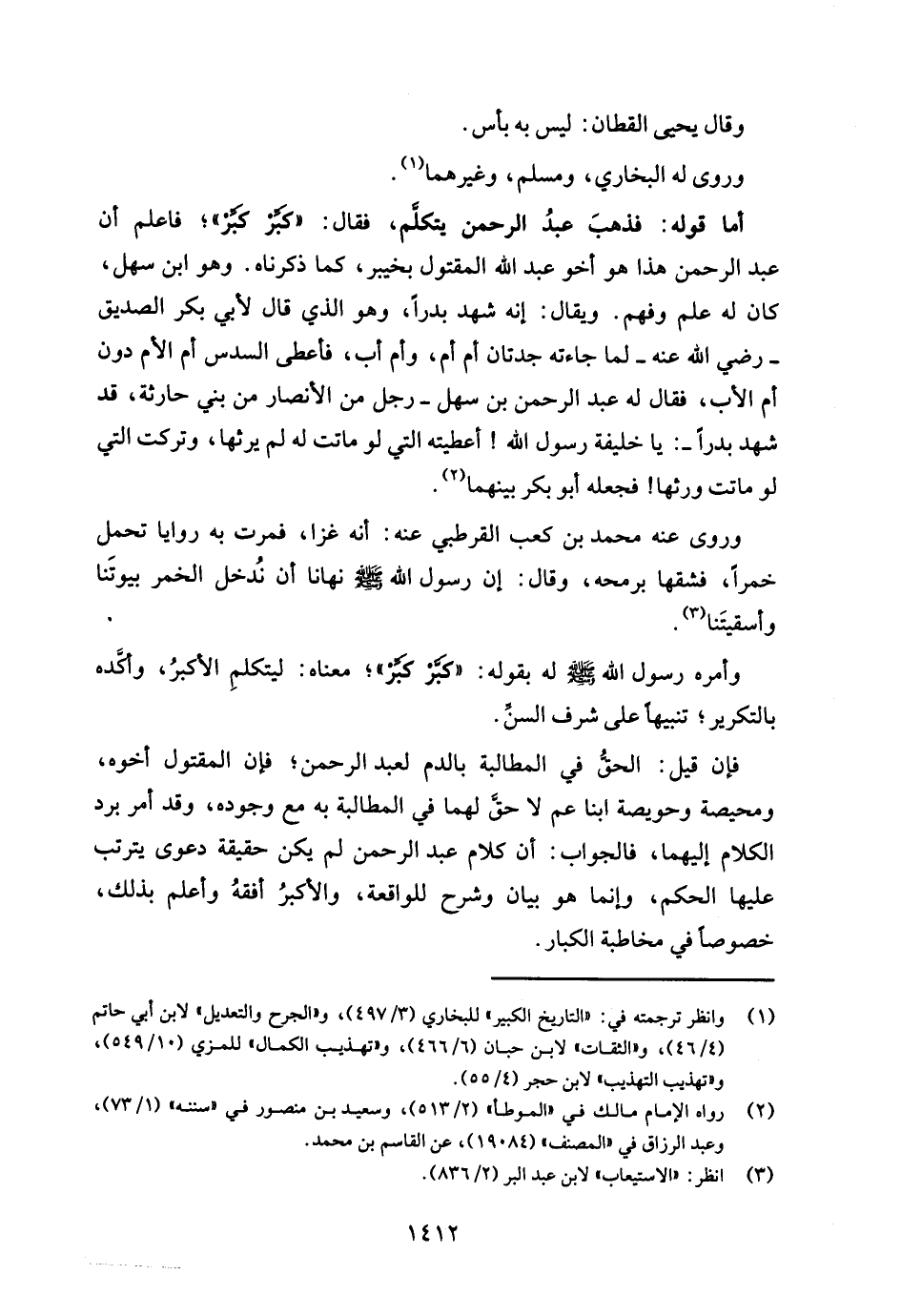 أما قوله: فذهبَ عبدُ الرحمن يتكلّم، فقال: "كَبِّرْ كَبِّرْ"؛ فاعلم أن عبد الرحمن هذا هو أخو عبد الله المقتول بخيبر، كما ذكرناه. وهو ابن سهل، كان له علم وفهم. ويقال: إنه شهد بدرًا، وهو الذي قال لأبي بكر الصديق - رضي الله عنه - لما جاءته جدتان أم أم، وأم أب، فأعطى السدس أم الأم دون أم الأب، فقال له عبد الرحمن بن سهل -رجل من الأنصار من بني حارثة، قد شهد بدرًا-: يا خليفة رسول الله! أعطيته التي لو ماتت له لم يرثها، وتركت التي لو ماتت ورثها! فجعله أبو بكر بينهما (¬2).