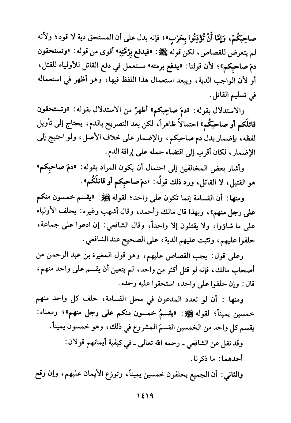 والاستدلال بقوله: "دمَ صاحِبكم" أظهرُ من الاستدلال بقوله: "وتستحقون قاتلَكم أو صاحبَكُم" احتمالًا ظاهرًا، لكن بعد التصريح بالدم، يحتاج إلى تأويل لفظه، بإضمار بدل دم صاحبكم، والإضمار على خلاف الأصل، ولو احتيج إلى الإضمار، لكان أقرب إلى اقتضاء حمله على إراقة الدم.