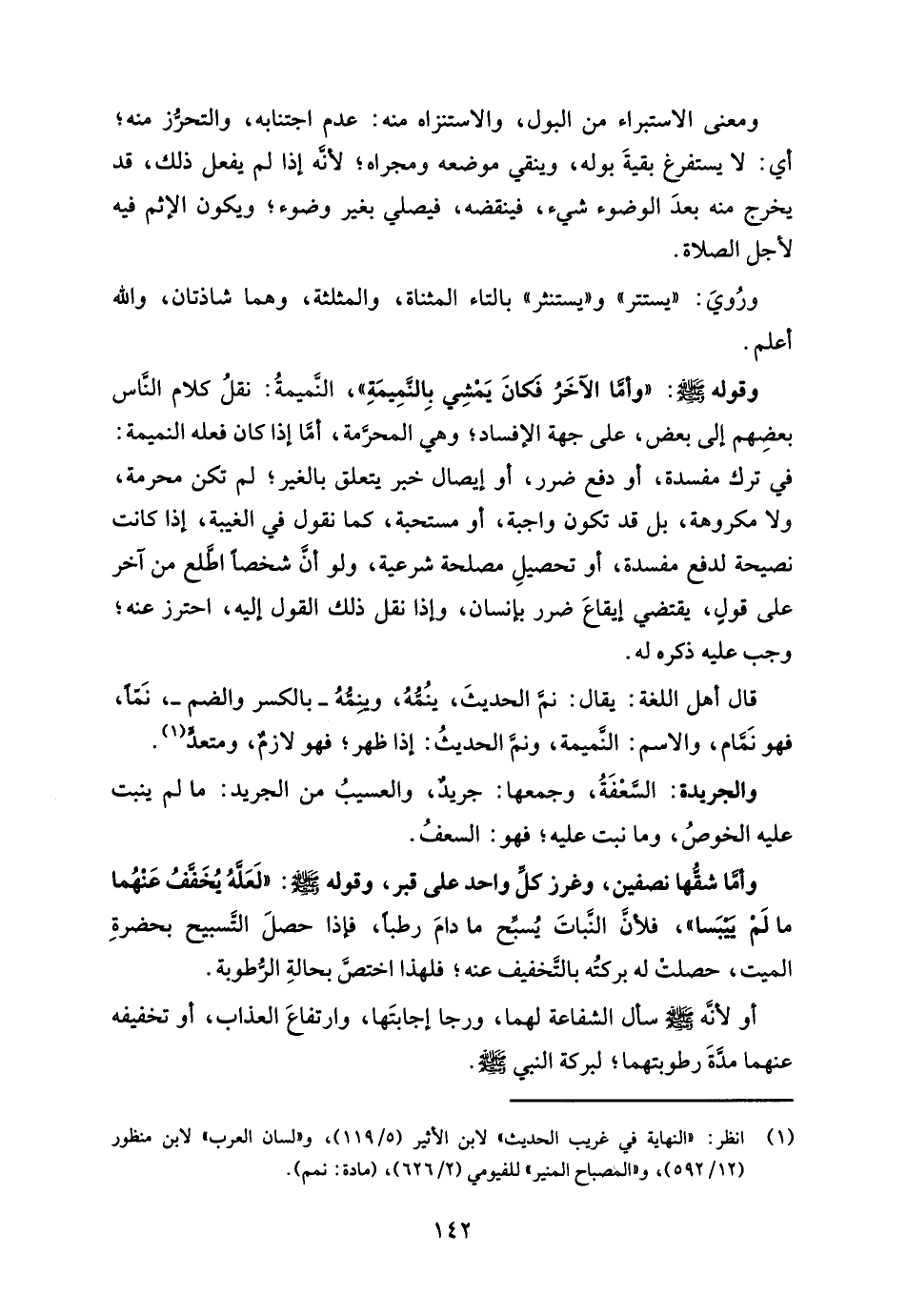 وقوله - صلى الله عليه وسلم -: "وأمَّا الآخَرُ فكانَ يَمْشِي بِالنَّمِيمَةِ"، النميمةُ: نقلُ كلام الناس بعضِهم إلى بعض، على جهة الإفساد؛ وهي المحرَّمة، أمَّا إذا كان فعله النميمة: في ترك مفسدة، أو دفع ضرر، أو إيصال خبر يتعلق بالغير؛ لم تكن محرمة، ولا مكروهة، بل قد تكون واجبة، أو مستحبة، كما نقول في الغيبة، إذا كانت نصيحة لدفع مفسدة، أو تحصيلِ مصلحة شرعية، ولو أن شخصًا اطَّلع من آخر على قولِ، يقتضي إيقاعَ ضرر بإنسان، وإذا نقل ذلك القول إليه، احترز عنه؛ وجب عليه ذكره له.