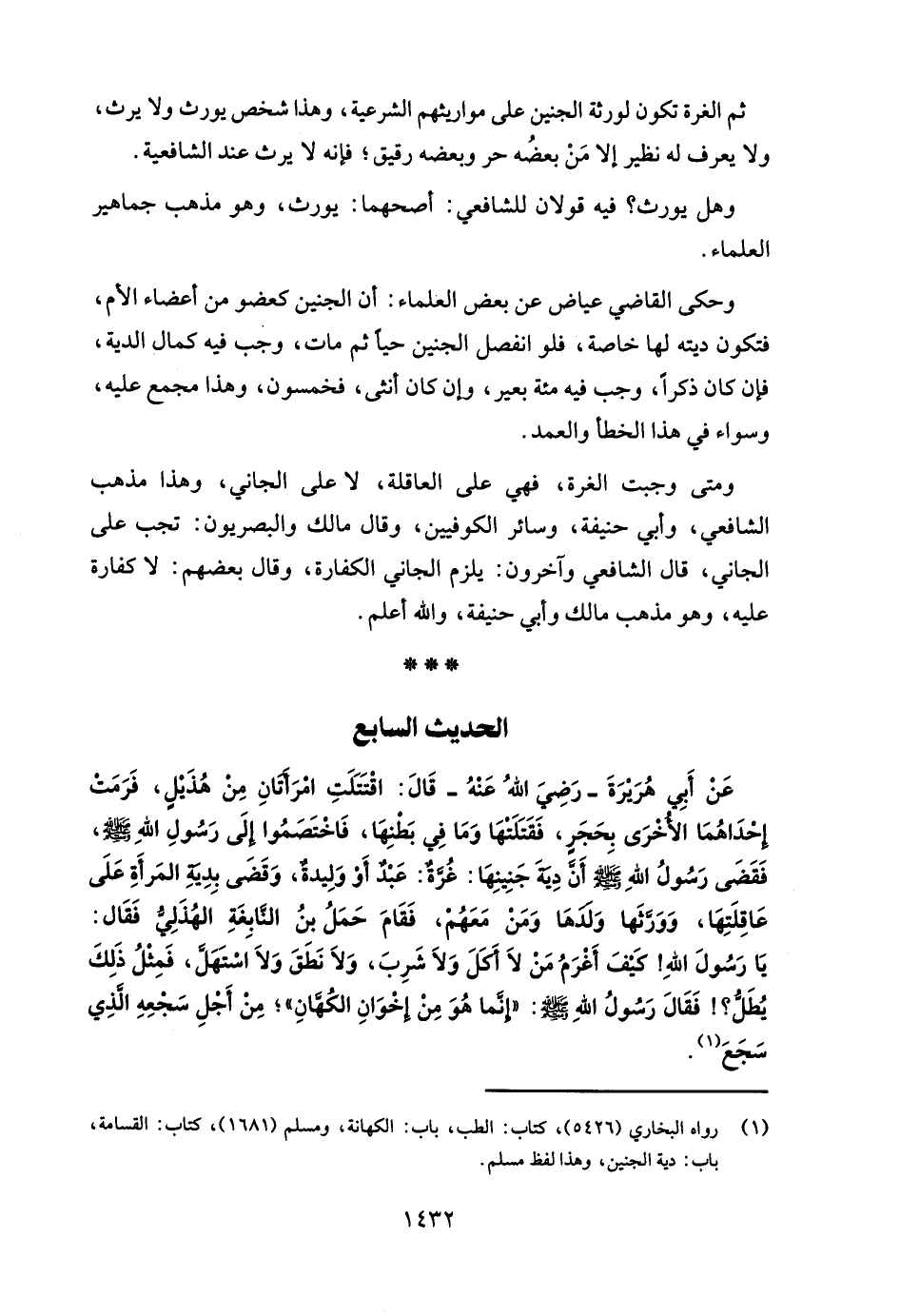 عَنْ أَبي هُرَيْرَةَ - رَضِيَ اللهُ عَنْهُ - قَالَ: اقْتَتَلَتِ امرَأتانِ من هُذَيْلِ، فَرَمَتْ إحْدَاهُمَا الأُخرَى بِحَجَرٍ، فَقَتَلَتهَا وَمَا في بَطْنِهَا، فَاخْتَصَمُوا إلَى رَسُولِ اللهِ - صلى الله عليه وسلم -، فَقَضَى رَسُولُ اللهِ - صلى الله عليه وسلم - أَن دِيةَ جَنِينِهَا: غرَّةٌ: عَبْدٌ أَوْ وَلِيدةٌ، وَقَضَى بِدِيَةِ المَرأَةِ عَلَى عَاقِلَتِهَا، وَوَرَّثَها وَلدَهَا وَمَنْ مَعَهُمْ، فَقَامَ حَمَلُ بنُ النَّابِغَةِ الهُذَلِيُّ فَقَال: يَا رَسُولَ اللهِ! كيفَ أَغْرَمُ مَنْ لَا أَكَلَ وَلَا شَرِبَ، وَلَا نَطَقَ وَلَا اسْتَهَل، فَمِثْلُ ذَلِكَ يُطَلُّ؟! فَقَالَ رَسُولُ اللهِ - صلى الله عليه وسلم -: "إنَّما هُوَ مِنْ إخْوَانِ الكُفانِ"؛ مِنْ أَجلِ سَجعِهِ الذِي سَجَعَ (¬1).