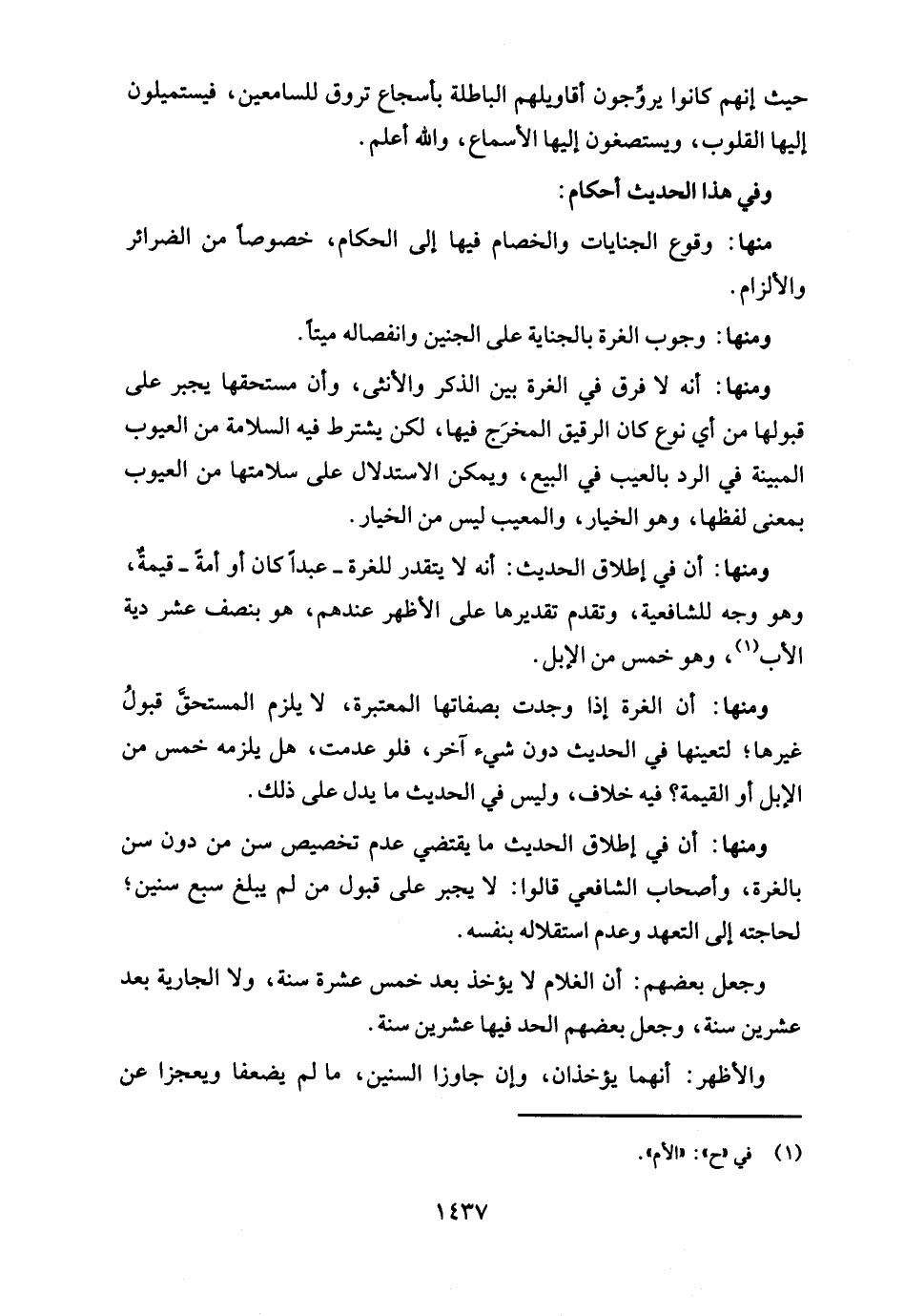ومنها: أن الغرة إذا وجدت بصفاتها المعتبرة، لا يلزم المستحق قبولُ غيرها؛ لتعينها في الحديث دون شيء آخر، فلو عدمت، هل يلزمه خمس من الإبل أو القيمة؟ فيه خلاف، وليس في الحديث ما يدل على ذلك.