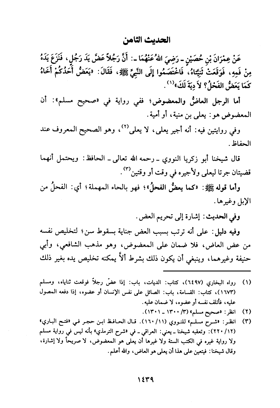عَنْ عِمْرَانَ بْنِ حُصَيْنٍ -رَضِيَ اللهُ عَنْهُمَا-: أَن رَجُلاَ عَضَّ يَدَ رَجُلٍ، فنَزَعَ يَدَهُ مِنْ فَمِهِ، فَوَقَعَتْ ثَنِيَّتاهُ، فَاخْتَصَمُوا إلَى النبِيّ - صلى الله عليه وسلم -، فَقَالَ: "يَعَضُّ أَحَدُكمْ أَخَاهُ كَمَا يَعَضُّ الفَحْلُ؟ لَا دِيةَ لَكَ" (¬1).