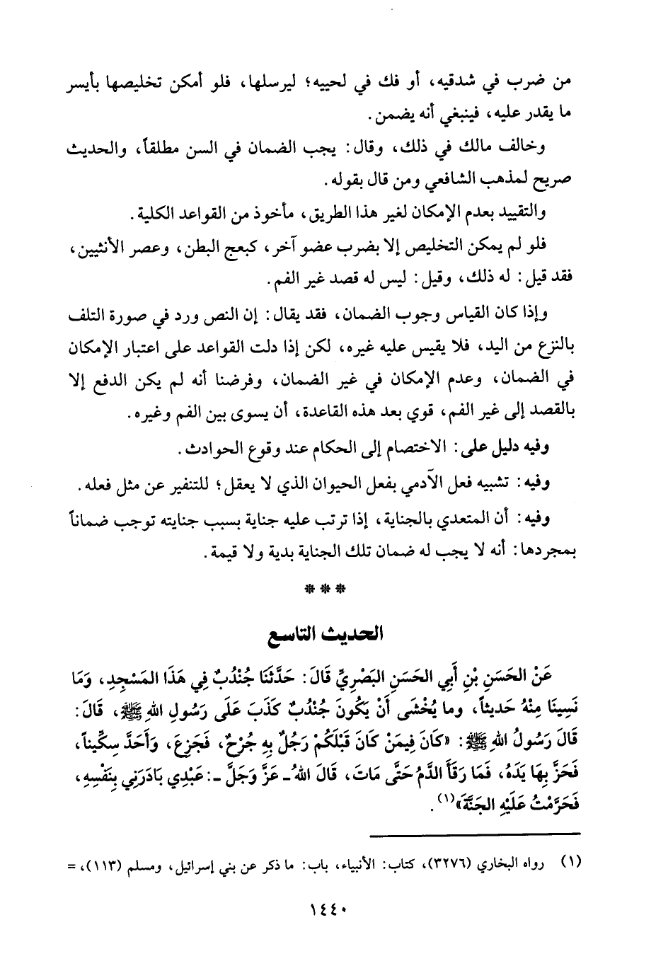 عَنْ الحَسَنِ بْنِ أَبِي الحَسَنِ البَصْرِيّ قَالَ: حَدَّثنَا جُنْدُبٌ في هَذَا المَسْجِدِ، وَمَا نَسِينَا مِنْهُ حَديثًا، وما يُخْشَى أَنْ يكُونَ جُنْدُبٌ كَذَبَ عَلَى رَسُولِ اللهِ - صلى الله عليه وسلم -، قالَ: قَالَ رَسُولُ الله - صلى الله عليه وسلم -: "كَانَ فِيمَنْ كَانَ قَبْلَكُمْ رَجُل بِهِ جُرْحٌ، فَجَرحَ، وَأَحَدَّ سِكِّينًا، فَحَزَّ بِهَا يَدَهُ، فَمَا رَقَأَ الدَّمُ حَتَّى مَاتَ، قَالَ اللهُ -عَزَّ وَجَل-: عَبْدِي بَادَرَنِي بنفْسِهِ، فَحَرَّمْتُ عَلَيْهِ الجَنةَ" (¬1).