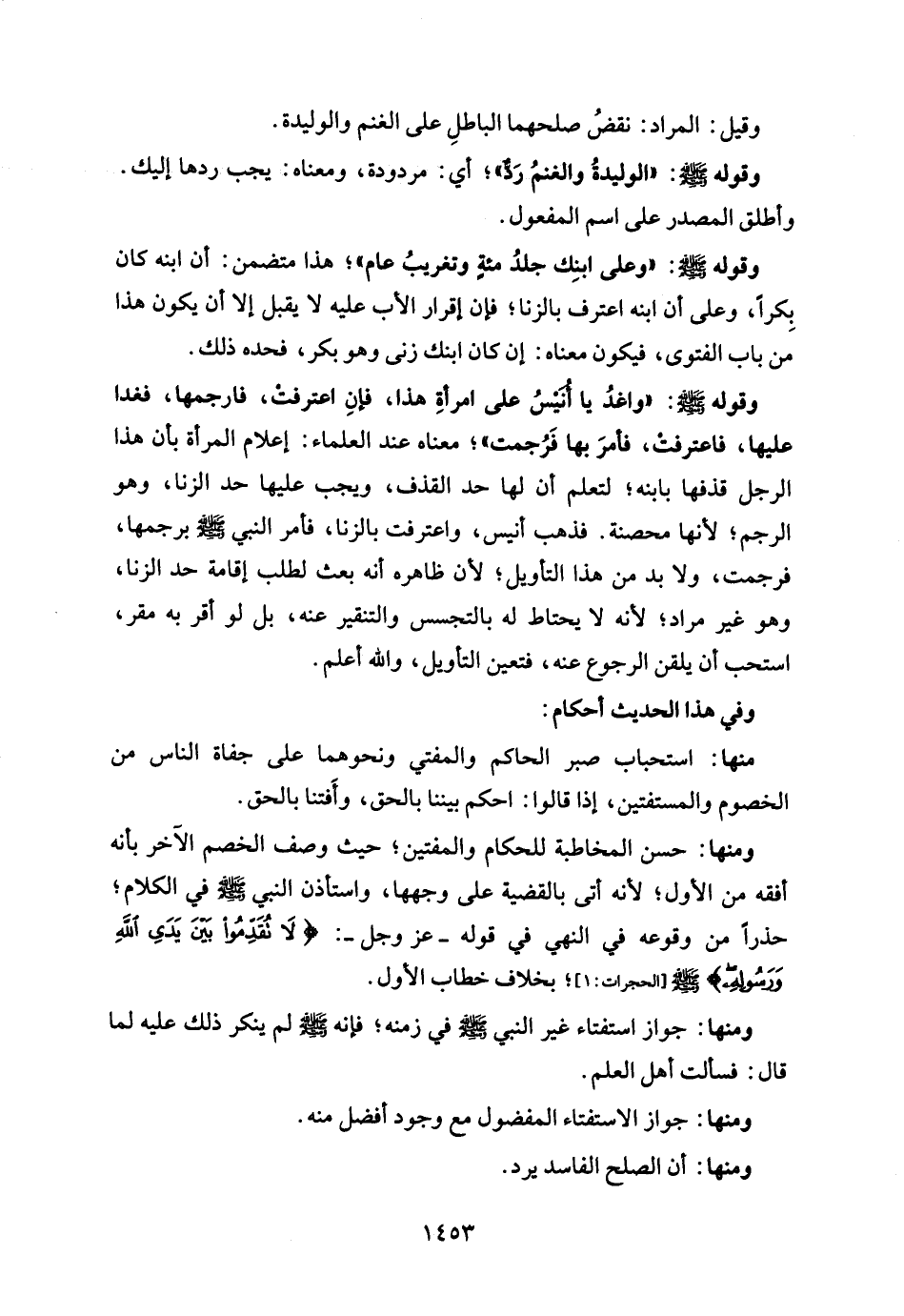 وقوله - صلى الله عليه وسلم -: "واغدُ يا أُنَيْسُ على امرأةِ هذا، فإنِ اعترفت، فارجمها، فغدا عليها، فاعترفتْ، فأَمرَ بها فَرُجمت"؛ معناه عند العلماء: إعلام المرأة بأن هذا الرجل قذفها بابنه؛ لتعلم أن لها حد القذف، ويجب عليها حد الزنا، وهو الرجم؛ لأنها محصنة. فذهب أنيس، واعترفت بالزنا، فأمر النبي - صلى الله عليه وسلم - برجمها، فرجمت، ولا بد من هذا التأويل؛ لأن ظاهره أنه بعث لطلب إقامة حد الزنا، وهو غير مراد؛ لأنه لا يحتاط له بالتجسس والتنقير عنه، بل لو أقر به مقر، استحب أن يلقن الرجوع عنه، فتعين التأويل، والله أعلم.